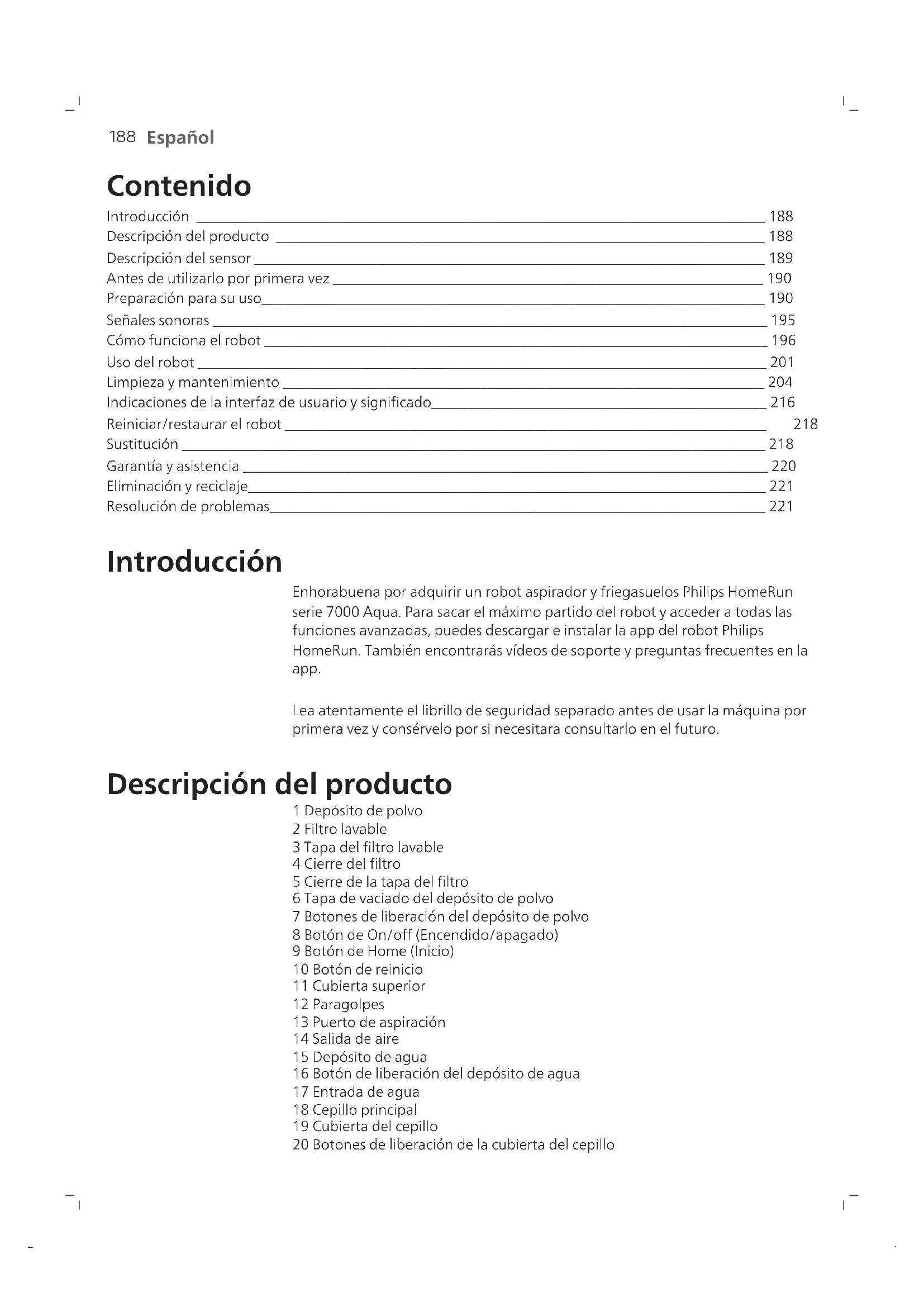 Español Contenido Introducción ______________________________________________________________________________ 188 Descripción del producto ___________________________________________________________________ 188 Descripción del sensor ______________________________________________________________________ 189 Antes de utilizarlo por primera vez ___________________________________________________________ 190 Preparación para su uso_____________________________________________________________________ 190 Señales sonoras ____________________________________________________________________________ 195 Cómo funciona el robot _____________________________________________________________________ 196 Uso del robot ______________________________________________________________________________ 201 Limpieza y mantenimiento __________________________________________________________________ 204 Indicaciones de la interfaz de usuario y significado______________________________________________ 216 Reiniciar/restaurar el robot __________________________________________________________________ 218 Sustitución ________________________________________________________________________________ 218 Garantía y asistencia ________________________________________________________________________ 220 Eliminación y reciclaje_______________________________________________________________________ 221 Resolución de problemas____________________________________________________________________ 221 Introducción Enhorabuena por adquirir un robot aspirador y friegasuelos Philips HomeRun serie 7000 Aqua. Para sacar el máximo partido del robot y acceder a todas las funciones avanzadas, puedes descargar e instalar la app del robot Philips HomeRun. También encontrarás vídeos de soporte y preguntas frecuentes en la app. Lea atentamente el librillo de seguridad separado antes de usar la máquina por primera vez y consérvelo por si necesitara consultarlo en el futuro. Descripción del producto 1 Depósito de polvo 2 Filtro lavable 3 Tapa del filtro lavable 4 Cierre del filtro 5 Cierre de la tapa del filtro 6 Tapa de vaciado del depósito de polvo 7 Botones de liberación del depósito de polvo 8 Botón de On/off (Encendido/apagado) 9 Botón de Home (Inicio) 10 Botón de reinicio 11 Cubierta superior 12 Paragolpes 13 Puerto de aspiración 14 Salida de aire 15 Depósito de agua 16 Botón de liberación del depósito de agua 17 Entrada de agua 18 Cepillo principal 19 Cubierta del cepillo 20 Botones de liberación de la cubierta del cepillo189 Español 21 Ruedas principales 22 Rueda giratoria delantera 23 Puntos de contacto de carga (robot) 24 Cepillo lateral 25 Soporte para mopa 26 Almohadilla para mopa lavable (2 unidades) 27 Cable de alimentación (XU7000) 28 Base (de carga) (XU7000) 29 Ventana de señal de infrarrojos (XU7000) 30 Puntos de contacto de carga (base) 31 Toma para cable de alimentación 32 Esterilla (XU7000) 33 Bolsa de polvo (2 unidades) (XU7100) 34 Tapa del depósito 35 Compartimento de la bolsa de polvo 36 Estación de vaciado automático (XU7100) 37 Piloto indicador 38 Luz señal de infrarrojos 39 Rampa 40 Entrada de vaciado automático 41 Puerto de vaciado automático de aire 42 Puntos de contacto de carga (base) 43 Ventilación de escape 44 Cepillo de limpieza 45 Toma para cable de alimentación 46 Cable de alimentación (XU7100) Descripción del sensor