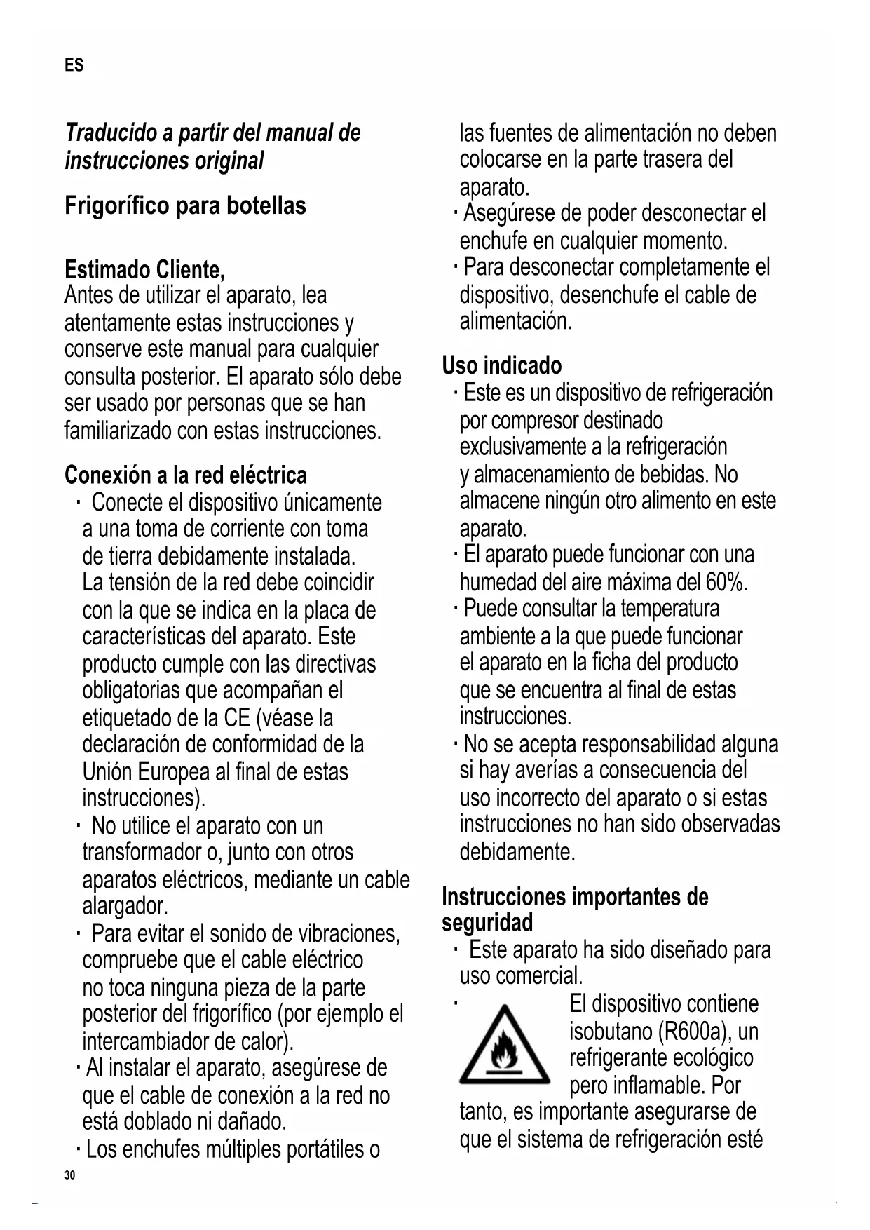 El dispositivo contiene isobutano (R600a), un refrigerante ecológico pero inamable. Por tanto, es importante asegurarse de que el sistema de refrigeración esté ES31 142 x 208 mm protegido durante el transporte y después de instalar el aparato. Si percibiera algún daño en el sistema, no encienda el dispositivo. Asegúrese de que el refrigerante esté lejos de cualquier fuego abierto y de fuentes de ignición; asimismo, ventile adecuadamente la habitación. ∙ Advertencia: Mantenga los oricios de ventilación, del interior del aparato o de la estructura incorporada, libres de obstrucciones. Debe asegurarse suciente ventilación en todo momento. ∙ Advertencia: No dañe el circuito de refrigeración. Cualquier fuga de refrigerante podría dañar los ojos; también existe peligro de que se produzca la combustión del gas. ∙ Advertencia: No utilice ningún aparato externo (por ejemplo radiadores o radiadores de aire) para acelerar el proceso de descongelación; siga únicamente los métodos recomendados en este manual. ∙ Advertencia: No utilizar ningún otro aparato eléctrico (por ejemplo un fabricador de cubitos de hielo) dentro del frigoríco a menos que este manual indique que está permitido. ∙ Antes de conectar el dispositivo, compruebe que el aparato y el cable de conexión a la red no han sufrido daños durante el transporte. Compruebe regularmente si el cable de conexión está dañado. Si percibiera algún daño en el cable de conexión, no encienda el dispositivo. ∙ Este aparato no ha sido diseñado para conservar sustancias explosivas como una lata de aerosol con gas propelente inamable. ∙ El estante admite un peso máximo de 25 kg. ∙ No utilice nunca estanterías, compartimentos, puertas, etc. como supercie de apoyo. ∙ Si el aparato se vende, se entrega a un tercero o se desecha en un punto de reciclaje apropiado, debe advertirse de la presencia de la sustancia aislante ‘ciclopentano’ y del refrigerante R600a. Consulte la sección Eliminación donde se incluye información adicional sobre cómo reciclar correctamente el aparato. ∙ Para cumplir con las normas de seguridad y evitar peligros, cualquier reparación o modicación del aparato debe ser realizada por personal del servicio técnico autorizado, incluida la sustitución del cable eléctrico. ∙ No se debe permitir que los niños realicen ningún trabajo de limpieza o mantenimiento del aparato a menos que estén bajo vigilancia. ∙ Para la limpieza regular del frigoríco recomendamos el uso de agua templada con un detergente suave. Para tener información detallada sobre la limpieza, consulte la sección Limpieza y descongelación. ∙ Para evitar el riesgo de accidentes personales o de averías en el aparato, este solo debe ser transportado con el32 142 x 208 mm embalaje original. Para desembalar e instalar el aparato, son necesarias 2 personas. ∙ Puede compensar las irregularidades del suelo con las patas ajustables para que el dispositivo tenga una estabilidad segura. ∙ Precaución: Mantenga a los niños alejados del material de embalaje, porque podría ser peligroso, existe el peligro de asxia. ∙ Para evitar el riesgo de incendio, no coloque ningún aparato termoeléctrico sobre el frigoríco. No colocar recipientes con líquido sobre el aparato: es importante evitar derramar o verter cualquier líquido que podría dañar el aislamiento eléctrico. ∙ Proteja siempre el interior del aparato de cualquier llama o fuente de ignición. ∙ Desenchufe el cable eléctrico de la toma de pared - en caso de funcionamiento defectuoso, - antes de descongelar el aparato, - durante su limpieza. - durante el mantenimiento/trabajos en el dispositivo. ∙ Cuando se desenchufa la clavija de la pared, nunca tirar del cable de alimentación. ∙ Durante todas las operaciones de limpieza y mantenimiento, desconecte el enchufe de la red, de manera que el operario pueda comprobar desde cualquier posición que el enchufe sigue retirado. ∙ ¡Advertencia! No retire la cubierta de la iluminación interior de LED. En caso de un defecto en la lámpara LED, contacte el servicio de atención al cliente. ∙ Si el aparato no se utiliza durante un largo periodo de tiempo, recomendamos mantener la puerta abierta. ∙ Asegúrese en todo momento, de que los niños no jueguen con el aparato y que no se queden encerrados por accidente. ∙ Nos reservamos el derecho de incorporar modicaciones técnicas. Familiarización con el producto