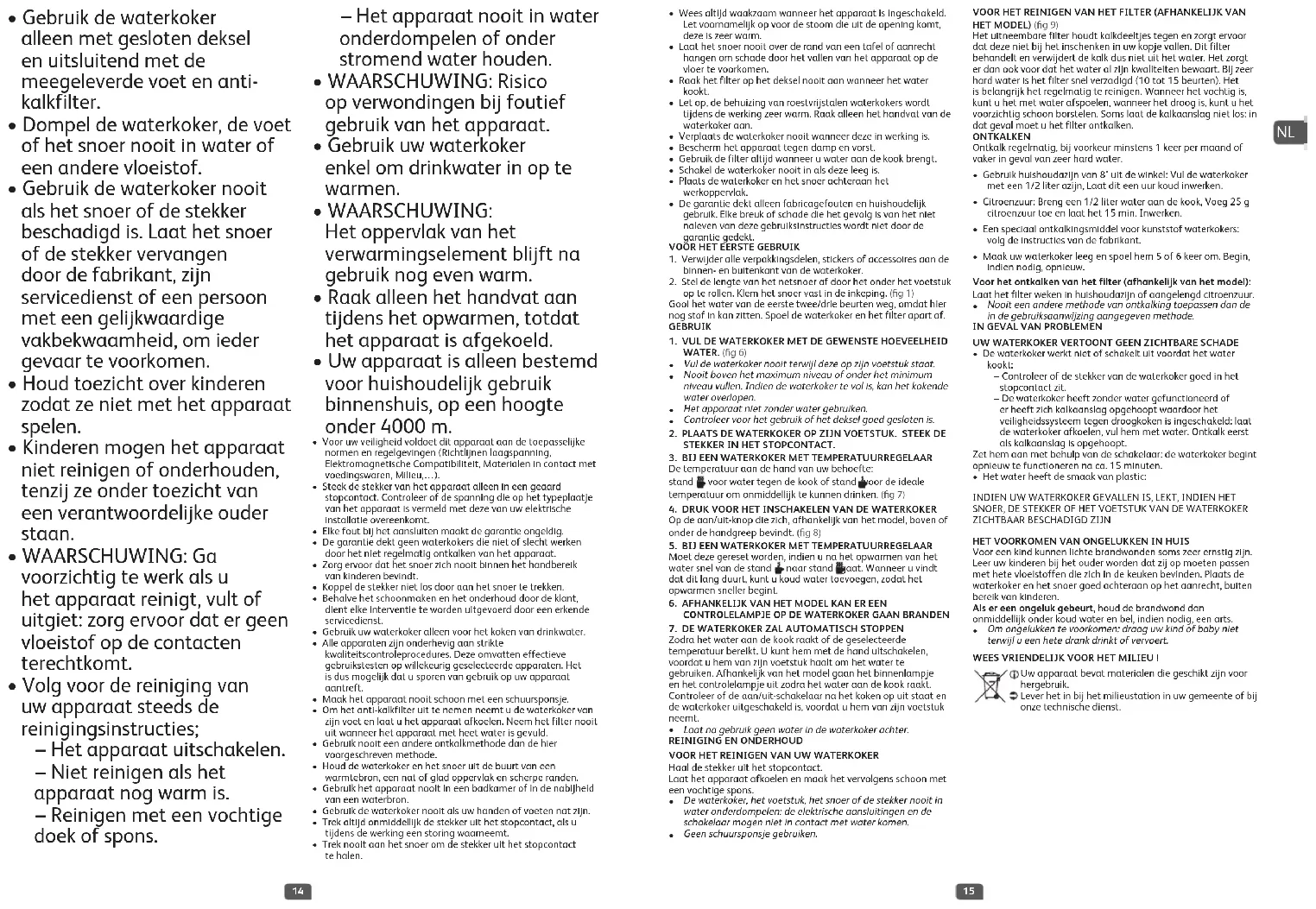 - El hervidor no funciona, o se para antes de la ebullición – Compruebe que el hervidor está bien conectado. – El hervidor ha funcionado sin agua, o se ha acumulado cal, provocando que se active el sistema de seguridad contra el funcionamiento en seco: deje enfriar el hervidor, llénelo de agua. Descalcifique primero el aparato si se han acumulado depósitos de cal. Póngalo en marcha con el interruptor: el hervidor empezará a funcionar de nuevo después de aproximadamente 15 minutos.