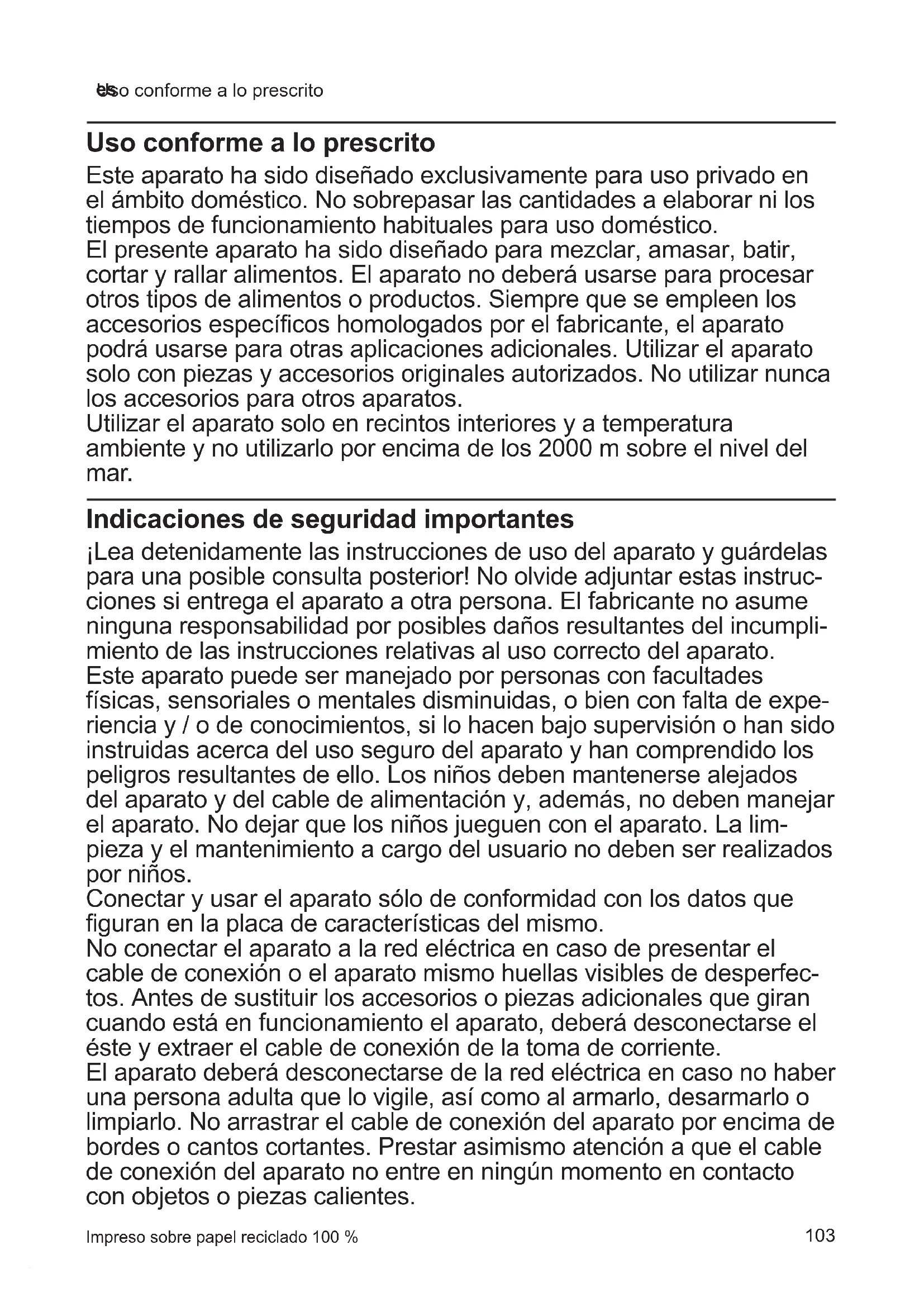 Uso conforme a lo prescrito Este aparato ha sido diseñado exclusivamente para uso privado en el ámbito doméstico. No sobrepasar las cantidades a elaborar ni los tiempos de funcionamiento habituales para uso doméstico. El presente aparato ha sido diseñado para mezclar, amasar, batir, cortar y rallar alimentos. El aparato no deberá usarse para procesar otros tipos de alimentos o productos. Siempre que se empleen los accesorios específicos homologados por el fabricante, el aparato podrá usarse para otras aplicaciones adicionales. Utilizar el aparato solo con piezas y accesorios originales autorizados. No utilizar nunca los accesorios para otros aparatos. Utilizar el aparato solo en recintos interiores y a temperatura ambiente y no utilizarlo por encima de los 2000 m sobre el nivel del mar. Indicaciones de seguridad importantes ¡Lea detenidamente las instrucciones de uso del aparato y guárdelas para una posible consulta posterior! No olvide adjuntar estas instruc- ciones si entrega el aparato a otra persona. El fabricante no asume ninguna responsabilidad por posibles daños resultantes del incumpli- miento de las instrucciones relativas al uso correcto del aparato. Este aparato puede ser manejado por personas con facultades físicas, sensoriales o mentales disminuidas, o bien con falta de expe- riencia y / o de conocimientos, si lo hacen bajo supervisión o han sido instruidas acerca del uso seguro del aparato y han comprendido los peligros resultantes de ello. Los niños deben mantenerse alejados del aparato y del cable de alimentación y, además, no deben manejar el aparato. No dejar que los niños jueguen con el aparato. La lim- pieza y el mantenimiento a cargo del usuario no deben ser realizados por niños. Conectar y usar el aparato sólo de conformidad con los datos que figuran en la placa de características del mismo. No conectar el aparato a la red eléctrica en caso de presentar el cable de conexión o el aparato mismo huellas visibles de desperfec- tos. Antes de sustituir los accesorios o piezas adicionales que giran cuando está en funcionamiento el aparato, deberá desconectarse el éste y extraer el cable de conexión de la toma de corriente. El aparato deberá desconectarse de la red eléctrica en caso no haber una persona adulta que lo vigile, así como al armarlo, desarmarlo o limpiarlo. No arrastrar el cable de conexión del aparato por encima de bordes o cantos cortantes. Prestar asimismo atención a que el cable de conexión del aparato no entre en ningún momento en contacto con objetos o piezas calientes. Impreso sobre papel reciclado 100 % Uso conforme a lo prescrito104