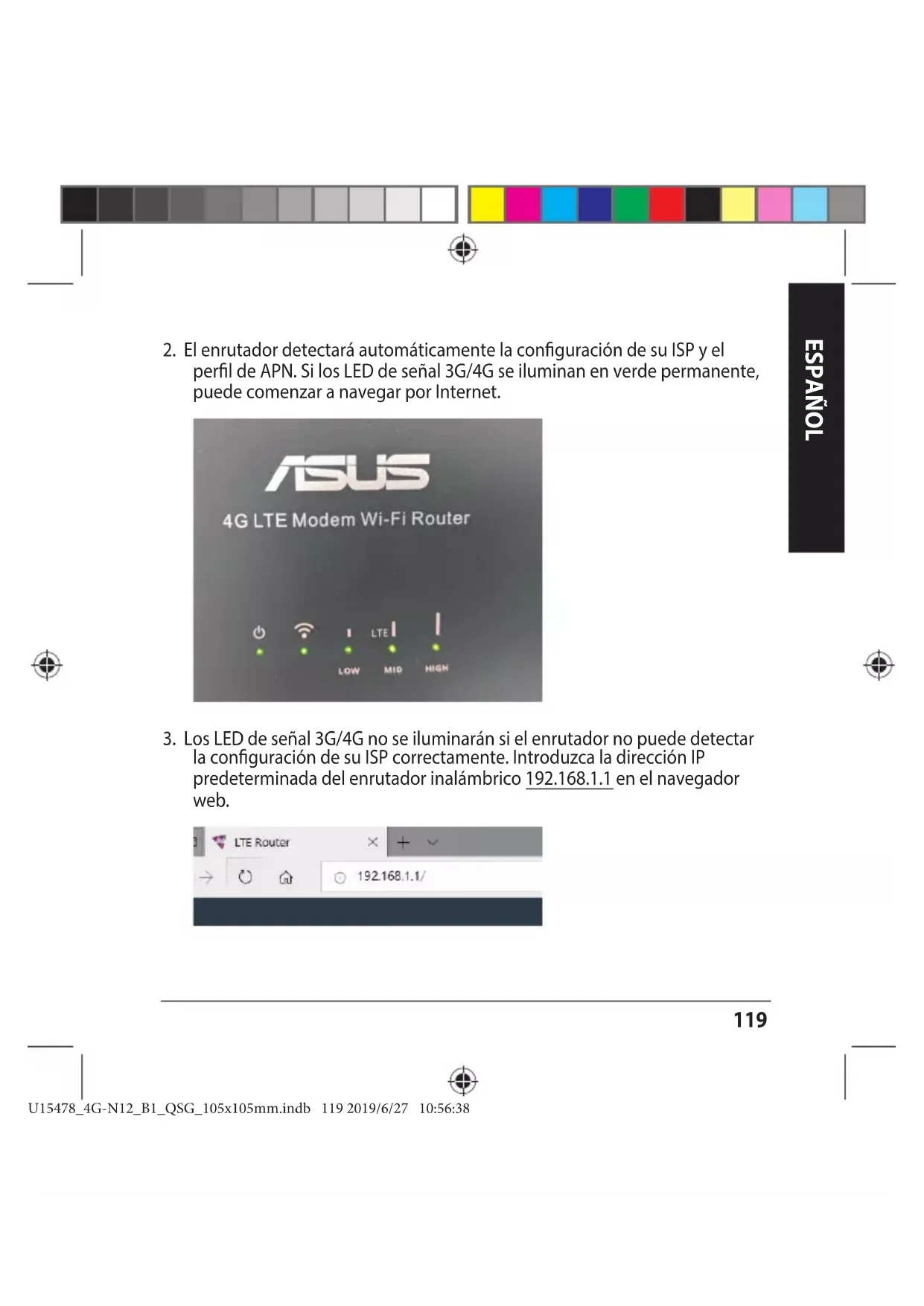 a los servicios WCDMA y LTE. Póngase en contacto con su proveedor de servicio móvil para obtener información acerca de estos servicios. ¡PRECAUCIÓN! t 6UJMJDFTPMBNFOUFVOBUBSKFUB.JDSP4*.64*.FTUÈOEBSDPOFM adaptador SIM incluido en su router. t Inserte siempre el adaptador Micro-SIM con la tarjeta Nano-SIM. El adaptador Micro-SIM podría obturarse si se inserta solo. t 6OFRVJQPDPOVOQVFSUP3+-"/&UIFSOFU#BTF5#BTF59PVO dispositivo Wi-Fi con una interfaz inalámbrica 802.11b/g/n de 2,4 GHz t &YQMPSBEPSXFCDPNPQPSFKFNQMP*OUFSOFU&YQMPSFS'JSFGPY4BGBSJP Google Chrome Mini SIM card Micro SIM card Nano SIM card Nano SIM adapter Nano SIM card with adapter U15478_4G-N12_B1_QSG_105x105mm.indb 117 2019/6/27 10:56:37ESPAÑOL