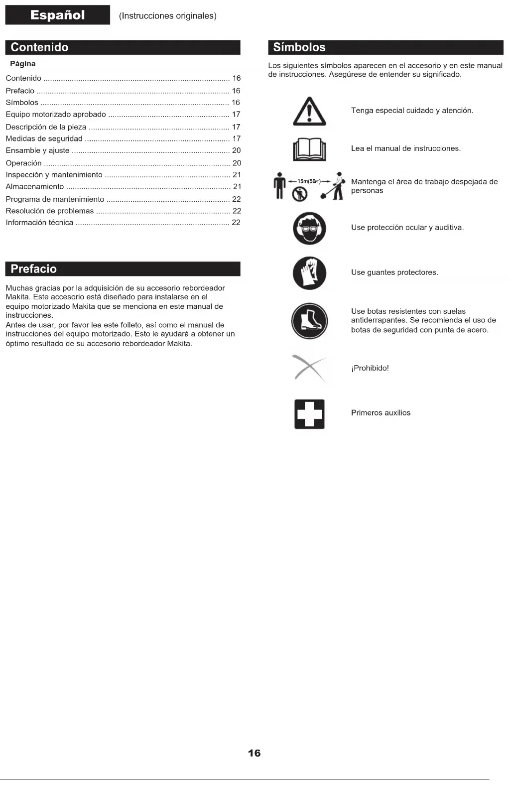 - Mantenga el rea de trabajo despejada de personas Use protección ocular y auditiva. Use guantes protectores. Use botas resistentes con suelas antiderrapantes. Se recomienda el uso de botas de seguridad con punta de acero. ¡Prohibido! Primeros auxilios Contenido p. 16