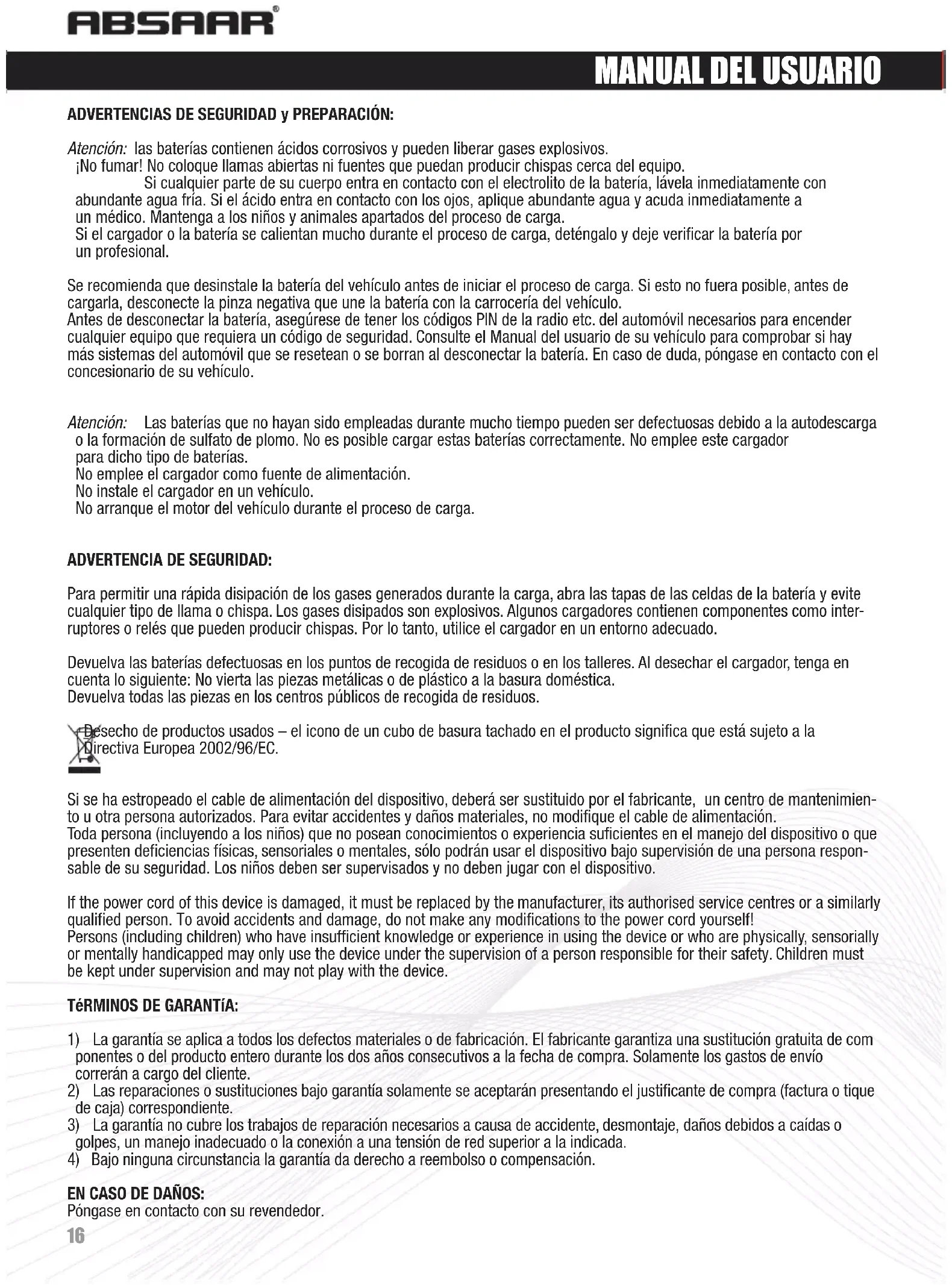(Panel posterior) (Panel anterior) ADVERTENCIAS DE SEGURIDAD y PREPARACIÓN: Atención: las baterías contienen ácidos corrosivos y pueden liberar gases explosivos. ¡No fumar! No coloque llamas abiertas ni fuentes que puedan producir chispas cerca del equipo. Si cualquier parte de su cuerpo entra en contacto con el electrolito de la batería, lávela inmediatamente con abundante agua fría. Si el ácido entra en contacto con los ojos, aplique abundante agua y acuda inmediatamente a un médico. Mantenga a los niños y animales apartados del proceso de carga. Si el cargador o la batería se calientan mucho durante el proceso de carga, deténgalo y deje verificar la batería por un profesional. Se recomienda que desinstale la batería del vehículo antes de iniciar el proceso de carga. Si esto no fuera posible, antes de cargarla, desconecte la pinza negativa que une la batería con la carrocería del vehículo. Antes de desconectar la batería, asegúrese de tener los códigos PIN de la radio etc. del automóvil necesarios para encender cualquier equipo que requiera un código de seguridad. Consulte el Manual del usuario de su vehículo para comprobar si hay más sistemas del automóvil que se resetean o se borran al desconectar la batería. En caso de duda, póngase en contacto con el concesionario de su vehículo. Atención: Las baterías que no hayan sido empleadas durante mucho tiempo pueden ser defectuosas debido a la autodescarga o la formación de sulfato de plomo. No es posible cargar estas baterías correctamente. No emplee este cargador para dicho tipo de baterías. No emplee el cargador como fuente de alimentación. No instale el cargador en un vehículo. No arranque el motor del vehículo durante el proceso de carga. ADVERTENCIA DE SEGURIDAD: Para permitir una rápida disipación de los gases generados durante la carga, abra las tapas de las celdas de la batería y evite cualquier tipo de llama o chispa. Los gases disipados son explosivos. Algunos cargadores contienen componentes como inter- ruptores o relés que pueden producir chispas. Por lo tanto, utilice el cargador en un entorno adecuado. Devuelva las baterías defectuosas en los puntos de recogida de residuos o en los talleres. Al desechar el cargador, tenga en cuenta lo siguiente: No vierta las piezas metálicas o de plástico a la basura doméstica. Devuelva todas las piezas en los centros públicos de recogida de residuos. Desecho de productos usados – el icono de un cubo de basura tachado en el producto significa que está sujeto a la Directiva Europea 2002/96/EC. Si se ha estropeado el cable de alimentación del dispositivo, deberá ser sustituido por el fabricante, un centro de mantenimien- to u otra persona autorizados. Para evitar accidentes y daños materiales, no modifique el cable de alimentación. Toda persona (incluyendo a los niños) que no posean conocimientos o experiencia suficientes en el manejo del dispositivo o que presenten deficiencias físicas, sensoriales o mentales, sólo podrán usar el dispositivo bajo supervisión de una persona respon- sable de su seguridad. Los niños deben ser supervisados y no deben jugar con el dispositivo. If the power cord of this device is damaged, it must be replaced by the manufacturer, its authorised service centres or a similarly qualified person. To avoid accidents and damage, do not make any modifications to the power cord yourself! Persons (including children) who have insufficient knowledge or experience in using the device or who are physically, sensorially or mentally handicapped may only use the device under the supervision of a person responsible for their safety. Children must be kept under supervision and may not play with the device. TéRMINOS DE GARANTíA: 1) La garantía se aplica a todos los defectos materiales o de fabricación. El fabricante garantiza una sustitución gratuita de com ponentes o del producto entero durante los dos años consecutivos a la fecha de compra. Solamente los gastos de envío correrán a cargo del cliente. 2) Las reparaciones o sustituciones bajo garantía solamente se aceptarán presentando el justificante de compra (factura o tique de caja) correspondiente.