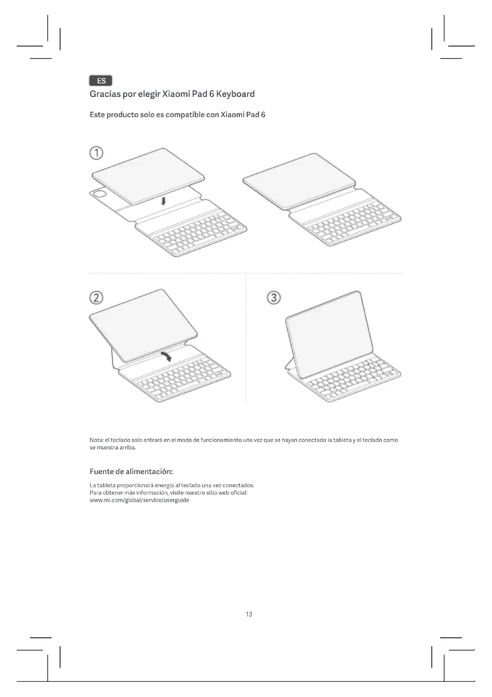 PAP 21 Carta PAP 22 Carta OTHER 7 Plastica RACCOLTA DIFFERENZIATA13 Gracias por elegir Xiaomi Pad 6 Keyboard Este producto solo es compatible con Xiaomi Pad 6 Nota: el teclado solo entrará en el modo de funcionamiento una vez que se hayan conectado la tableta y el teclado como se muestra arriba. Fuente de alimentación: La tableta proporcionará energía al teclado una vez conectados. Para obtener más información, visite nuestro sitio web oficial: www.mi.com/global/service/userguide ES14 WEEE Para desechar este producto de forma segura, se deben tomar precauciones especiales. Esta marca indica que este producto no debe desecharse con otros desechos domésticos en la UE. Para evitar posibles daños al medioambiente o a la salud humana provocados por la eliminación inadecuada de residuos y para fomentar la reutilización sostenible de los recursos materiales, recíclelo responsablemente. Para desechar de forma segura su dispositivo, utilice los sistemas de recolección y devolución, o póngase en contacto con el vendedor al que compró originalmente el producto. Información importante de seguridad Lea toda la información de seguridad a continuación antes de usar el dispositivo.