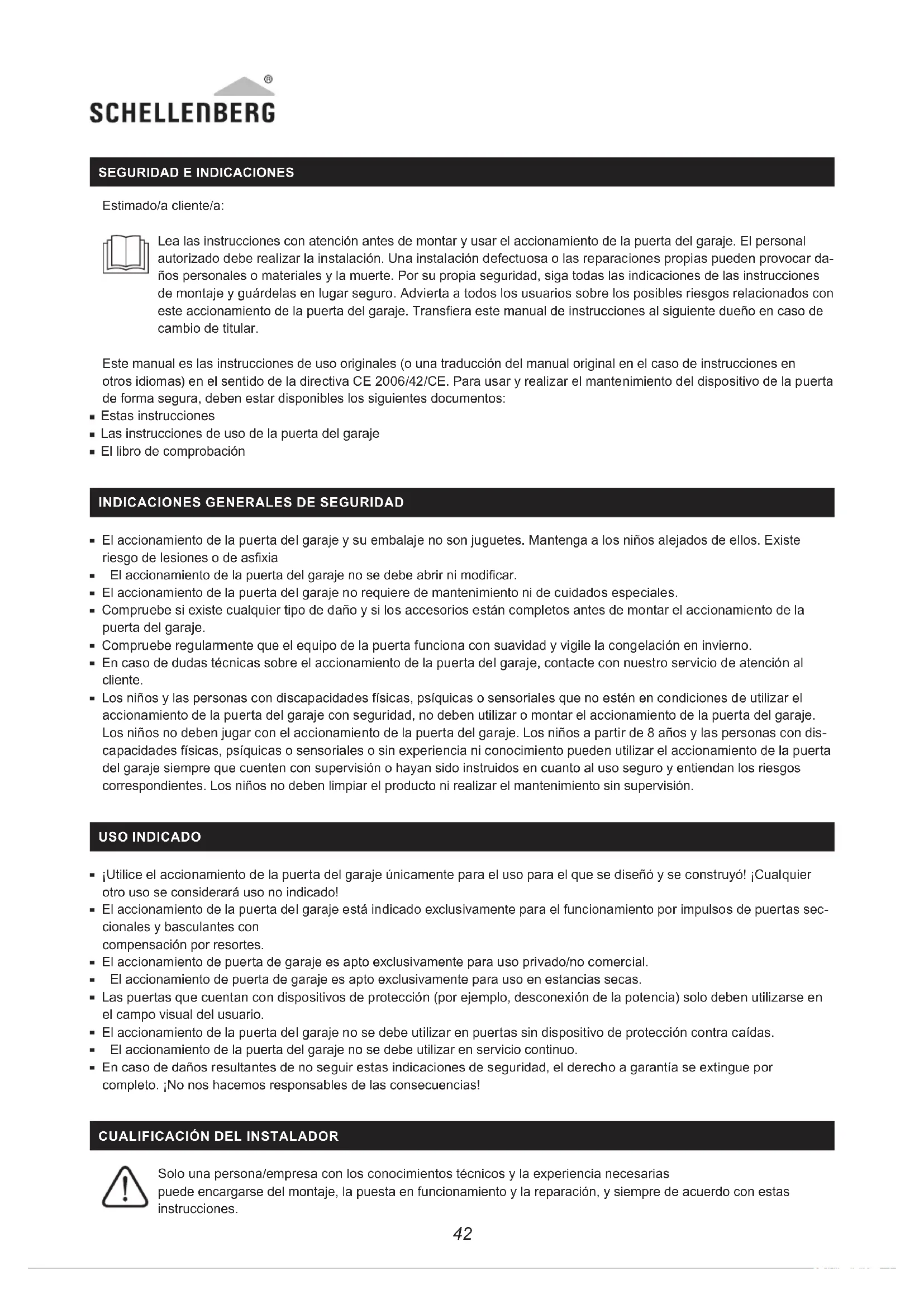 Estimado/a cliente/a: Lea las instrucciones con atención antes de montar y usar el accionamiento de la puerta del garaje. El personal autorizado debe realizar la instalación. Una instalación defectuosa o las reparaciones propias pueden provocar da- ños personales o materiales y la muerte Por su propia seguridad, siga todas las indicaciones de las instrucciones de montaje y guárdelas en lugar seguro Advierta a todos los usuarios sobre los posibles riesgos relacionados con este accionamiento de la puerta del garaje. Transera este manual de instrucciones al siguiente dueño en caso de cambio de titular Este manual es las instrucciones de uso originales (o una traducción del manual original en el caso de instrucciones en otros idiomas) en el sentido de la directiva CE 2006/42/CE. Para usar y realizar el mantenimiento del dispositivo de la puerta de forma segura, deben estar disponibles los siguientes documentos: Estas instrucciones Las instrucciones de uso de la puerta del garaje El libro de comprobación