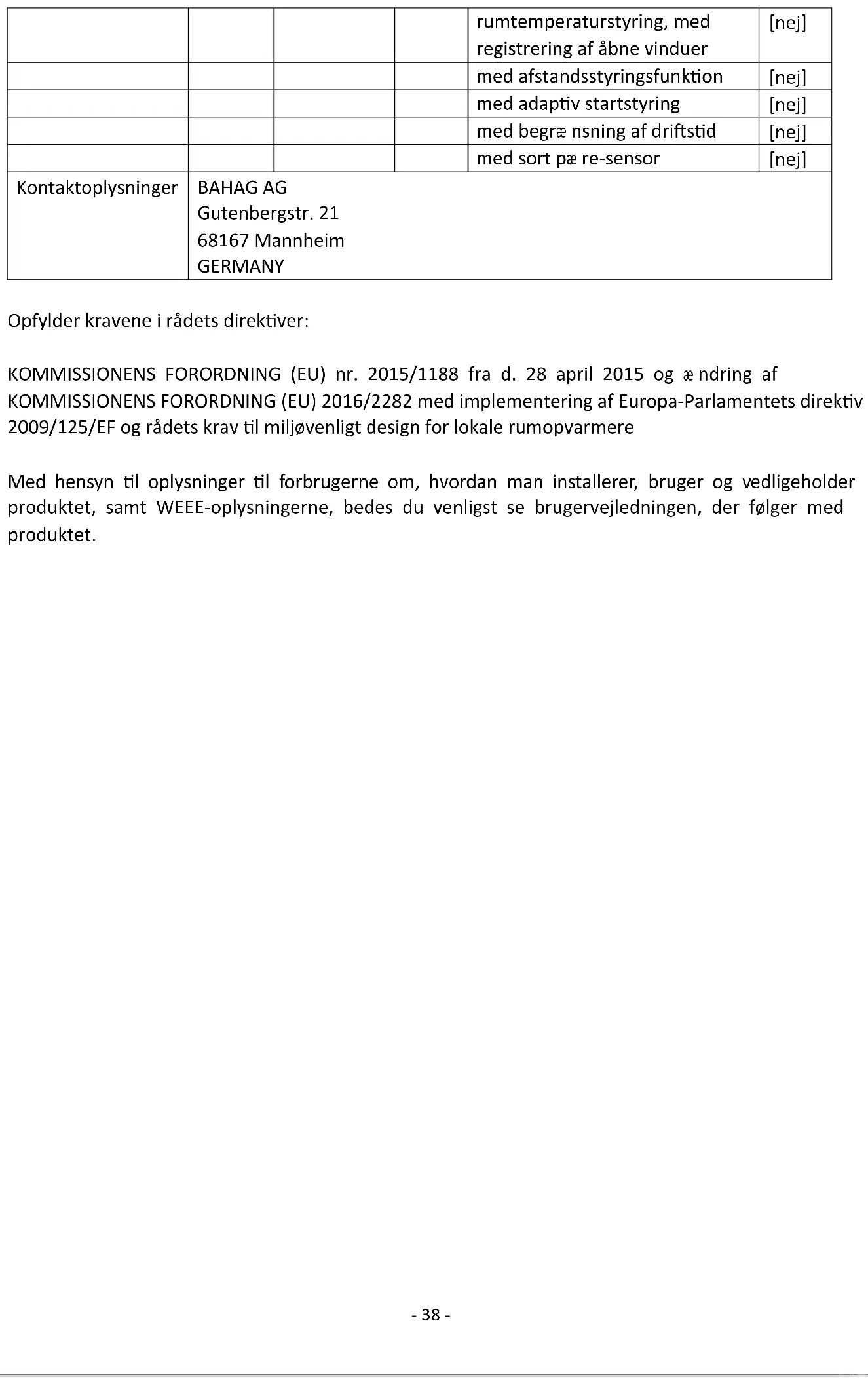 Voltaje de operaciones: 220-240V ~ 50/60Hz Consumo de poder: 2200-2400W Reciclaje – Directiva Europea 2012/19/UE Este símbolo indica que el producto no debe desecharse con otros residuos domésticos. Para evitar posibles daños al medioambiente o a la salud humana derivados de la eliminación descontrolada de residuos, recicle de manera responsable para promover la reutilización sostenible de los recursos materiales. Para devolver su aparato usado, utilice los sistemas de devolución y recogida o contacte con el minorista al que compró el producto. Ellos pueden enviar este producto para su reciclaje medioambientalmente seguro.- 44 - Información ERP (ES) Proveedor: BAHAG AG Gutenbergstr. 21 68167 Mannheim GERMANY Hace esta declaración sobre el producto cuyos datos figuran a continuación: Información requerida para los calefactores eléctricos de ambientes locales Identificador(es) de modelo: 21768363, 21768451 Elemento Símbolo Valor Unidad Elemento Unidad Potencia calorífica