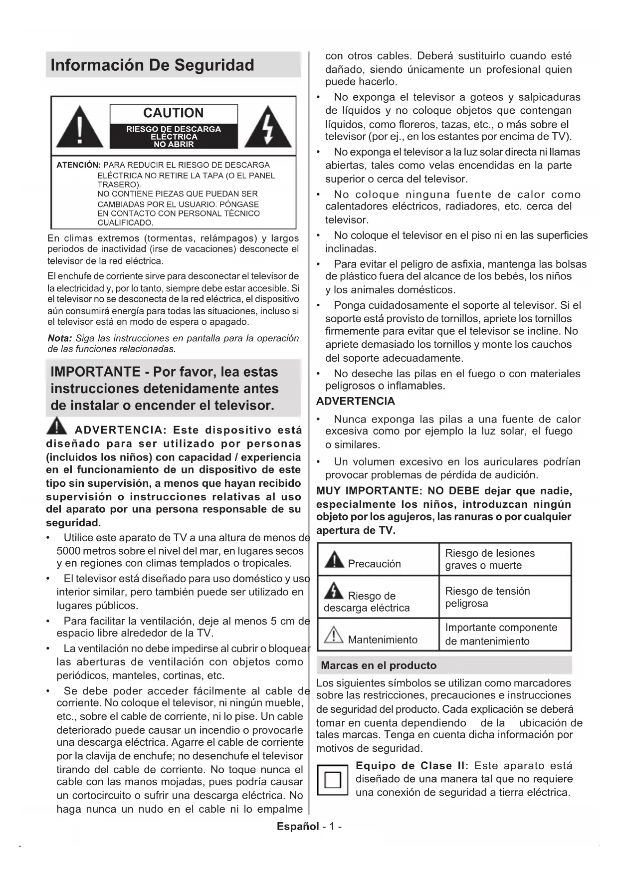 ADVERTENCIA Nunca exponga las pilas a una fuente de calor excesiva como por ejemplo la luz solar, el fuego o similares. Un volumen excesivo en los auriculares podrían provocar problemas de pérdida de audición. MUY IMPORTANTE: NO DEBE dejar que nadie, especialmente los niños, introduzcan ningún objeto por los agujeros, las ranuras o por cualquier apertura de TV. Precaución Riesgo de lesiones graves o muerte Riesgo de descarga eléctrica Riesgo de tensión peligrosa Mantenimiento Importante componente de mantenimiento Marcas en el producto Los siguientes símbolos se utilizan como marcadores sobre las restricciones, precauciones e instrucciones de seguridad del producto.