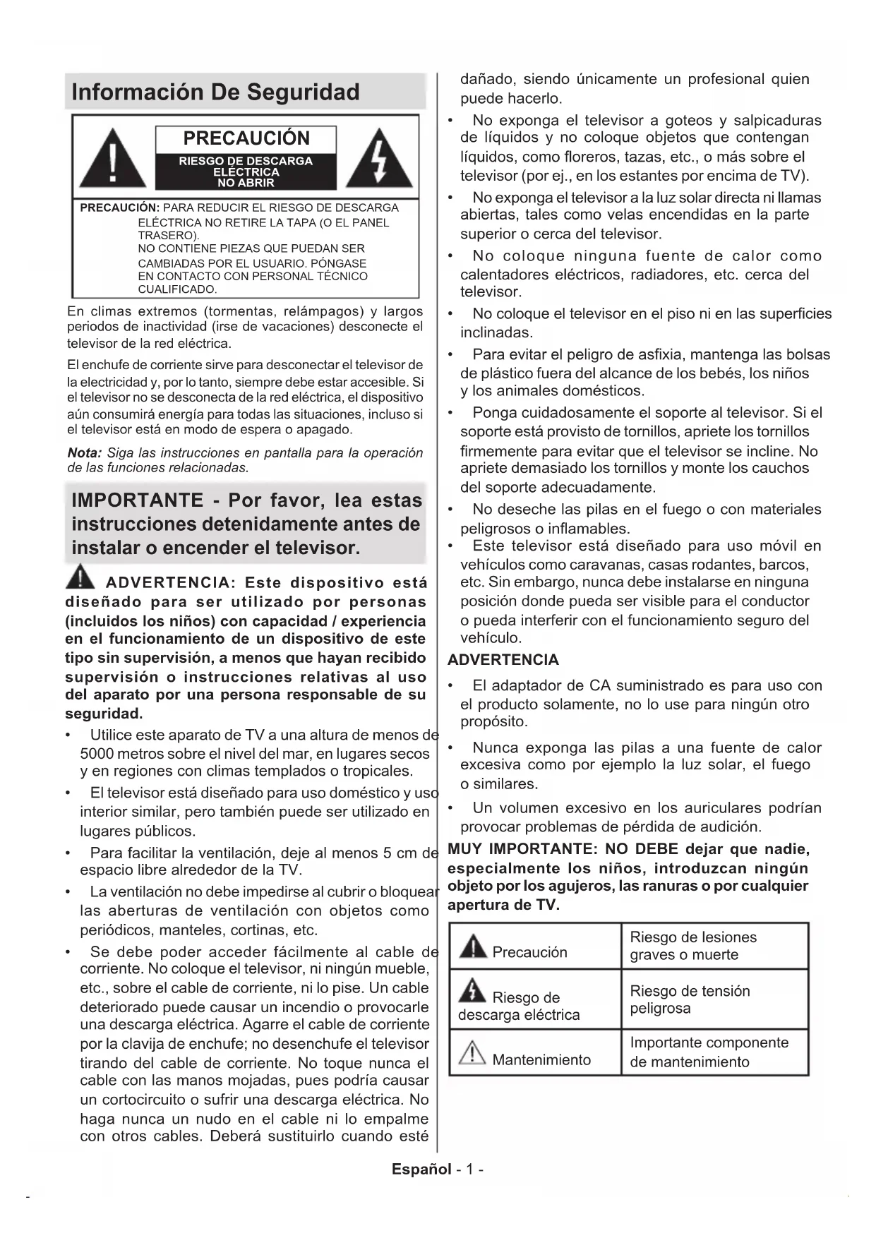 (**) Depends on modelEspañol - 1 - Información De Seguridad PRECAUCIÓN RIESGO DE DESCARGA ELÉCTRICANO ABRIRPRECAUCIÓN: PARA REDUCIR EL RIESGO DE DESCARGA ELÉCTRICA NO RETIRE LA TAPA (O EL PANEL TRASERO). NO CONTIENE PIEZAS QUE PUEDAN SER CAMBIADAS POR EL USUARIO. PÓNGASE EN CONTACTO CON PERSONAL TÉCNICO CUALIFICADO.Nota: Siga las instrucciones en pantalla para la operación de las funciones relacionadas.En climas extremos (tormentas, relámpagos) y largos periodos de inactividad (irse de vacaciones) desconecte el televisor de la red eléctrica.El enchufe de corriente sirve para desconectar el televisor de la electricidad y, por lo tanto, siempre debe estar accesible. Si el televisor no se desconecta de la red eléctrica, el dispositivo aún consumirá energía para todas las situaciones, incluso si el televisor está en modo de espera o apagado. IMPORTANTE - Por favor, lea estas instrucciones detenidamente antes de instalar o encender el televisor. ADVERTENCIA: Este dispositivo está diseñado para ser utilizado por personas (incluidos los niños) con capacidad / experiencia en el funcionamiento de un dispositivo de este tipo sin supervisión, a menos que hayan recibido supervisión o instrucciones relativas al uso del aparato por una persona responsable de su seguridad.