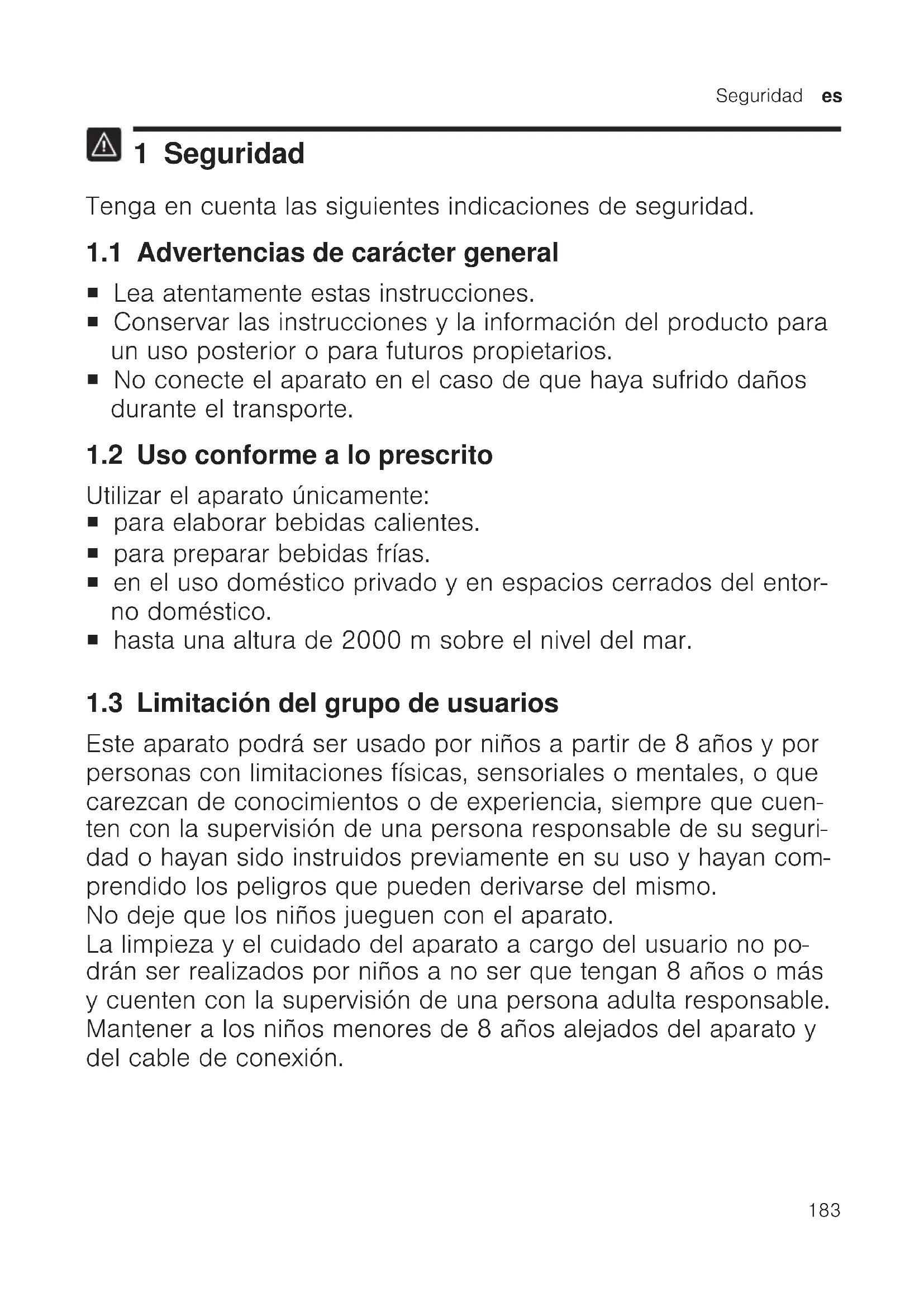 1 Seguridad Tenga en cuenta las siguientes indicaciones de seguridad. 1.1 Advertencias de carácter general ¡ Lea atentamente estas instrucciones. ¡ Conservar las instrucciones y la información del producto para un uso posterior o para futuros propietarios. ¡ No conecte el aparato en el caso de que haya sufrido daños durante el transporte. 1.2 Uso conforme a lo prescrito Utilizar el aparato únicamente: ¡ para elaborar bebidas calientes. ¡ para preparar bebidas frías. ¡ en el uso doméstico privado y en espacios cerrados del entor- no doméstico. ¡ hasta una altura de 2000msobre el nivel del mar. 1.3 Limitación del grupo de usuarios Este aparato podrá ser usado por niños a partir de 8 años y por personas con limitaciones físicas, sensoriales o mentales, o que carezcan de conocimientos o de experiencia, siempre que cuen- ten con la supervisión de una persona responsable de su seguri- dad o hayan sido instruidos previamente en su uso y hayan com- prendido los peligros que pueden derivarse del mismo. No deje que los niños jueguen con el aparato. La limpieza y el cuidado del aparato a cargo del usuario no po- drán ser realizados por niños a no ser que tengan 8 años o más y cuenten con la supervisión de una persona adulta responsable. Mantener a los niños menores de 8 años alejados del aparato y del cable de conexión.es Seguridad