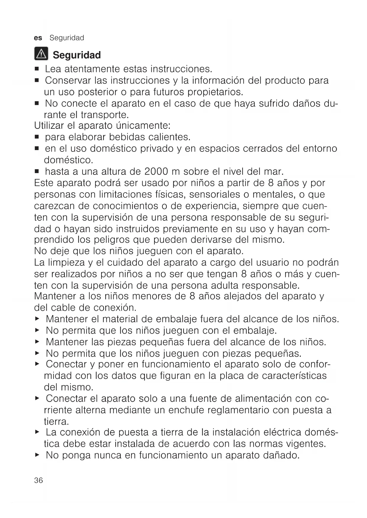 Seguridad ¡ Lea atentamente estas instrucciones. ¡ Conservar las instrucciones y la información del producto para un uso posterior o para futuros propietarios. ¡ No conecte el aparato en el caso de que haya sufrido daños du- rante el transporte. Utilizar el aparato únicamente: ¡ para elaborar bebidas calientes. ¡ en el uso doméstico privado y en espacios cerrados del entorno doméstico. ¡ hasta a una altura de 2000msobre el nivel del mar. Este aparato podrá ser usado por niños a partir de 8 años y por personas con limitaciones físicas, sensoriales o mentales, o que carezcan de conocimientos o de experiencia, siempre que cuen- ten con la supervisión de una persona responsable de su seguri- dad o hayan sido instruidos previamente en su uso y hayan com- prendido los peligros que pueden derivarse del mismo. No deje que los niños jueguen con el aparato. La limpieza y el cuidado del aparato a cargo del usuario no podrán ser realizados por niños a no ser que tengan 8 años o más y cuen- ten con la supervisión de una persona adulta responsable. Mantener a los niños menores de 8 años alejados del aparato y del cable de conexión. ▶ Mantener el material de embalaje fuera del alcance de los niños. ▶ No permita que los niños jueguen con el embalaje. ▶ Mantener las piezas pequeñas fuera del alcance de los niños. ▶ No permita que los niños jueguen con piezas pequeñas. ▶ Conectar y poner en funcionamiento el aparato solo de confor- midad con los datos que figuran en la placa de características del mismo. ▶ Conectar el aparato solo a una fuente de alimentación con co- rriente alterna mediante un enchufe reglamentario con puesta a tierra. ▶ La conexión de puesta a tierra de la instalación eléctrica domés- tica debe estar instalada de acuerdo con las normas vigentes. ▶ No ponga nunca en funcionamiento un aparato dañado.Seguridad es Impreso sobre papel reciclado 100% 37 ▶ No hacer funcionar nunca un aparato con una superficie agrieta- da o rota. ▶ No tirar nunca del cable de conexión a la red eléctrica para de- senchufar el aparato. Desenchufar siempre el cable de conexión de red de la toma de corriente. ▶ Si el aparato o el cable de conexión de red están dañados, de- senchufar inmediatamente el cable de conexión de red o desco- nectar el interruptor automático del cuadro eléctrico. ▶ Llame al Servicio de Asistencia Técnica. ▶ Solo el personal especializado puede realizar reparaciones e in- tervenciones en el aparato. ▶ Utilizar únicamente piezas de repuesto originales para la repara- ción del aparato. ▶ Si el cable de conexión de red de este aparato resulta dañado, debe sustituirlo el fabricante, el Servicio de Asistencia Técnica o una persona cualificada a fin de evitar posibles situaciones de peligro. ▶ No sumergir nunca el aparato o el cable de conexión de red en agua. ▶ No derramar ningún líquido sobre la conexión por enchufe del aparato. ▶ Utilizar el aparato solo en espacios interiores. ▶ No exponer el aparato a altas temperaturas y humedad. ▶ No utilizar limpiadores por chorro de vapor ni de alta presión pa- ra limpiar el aparato. ▶ Procurar una ventilación suficiente del aparato. ▶ No poner nunca el aparato en funcionamiento dentro de un ar- mario. ▶ Mantener el aparato siempre bajo vigilancia mientras esté fun- cionando. ▶ No utilizar alargaderas ni tomas de corriente múltiples. ▶ Si el cable de conexión de red es demasiado corto, ponerse en contacto con el servicio de asistencia técnica. ▶ Utilizar solo adaptadores autorizados por el fabricante. ▶ No abrir nunca el sistema de preparación durante el funciona- miento. ▶ Utilizar solo los T DISC originales de Tassimo.es Vista general 38 Impreso sobre papel reciclado 100% ▶ No utilizar nunca un T DISC dañado. ▶ No utilizar nunca un T DISC varias veces. ▶ No tocar nunca las piezas calientes del aparato. ▶ Después del uso dejar enfriar las piezas calientes del aparato antes de manipularlas. ▶ Si es necesario, dejar enfriar un poco las bebidas. ▶ Evitar el contacto de la piel con vapores y líquidos derramados. ▶ Para evitar el peligro de lesiones, utilizar el aparato únicamente conforme al uso previsto. ▶ Debe tenerse cuidado con los dedos al colocar el TDISC o al limpiar. ▶ Las personas con implantes electrónicos deberán mantener una distancia mínima de 10cm respecto al aparato. ▶ Respetar también la distancia mínima de 10cm respecto al de- pósito de agua retirado. ▶ Respetar las indicaciones de limpieza para la higiene del apara- to. Vista general Aquí encontrará una vista general de los componentes de su aparato. Nota:Los colores y elementos individuales pueden variar según el modelo de aparato.