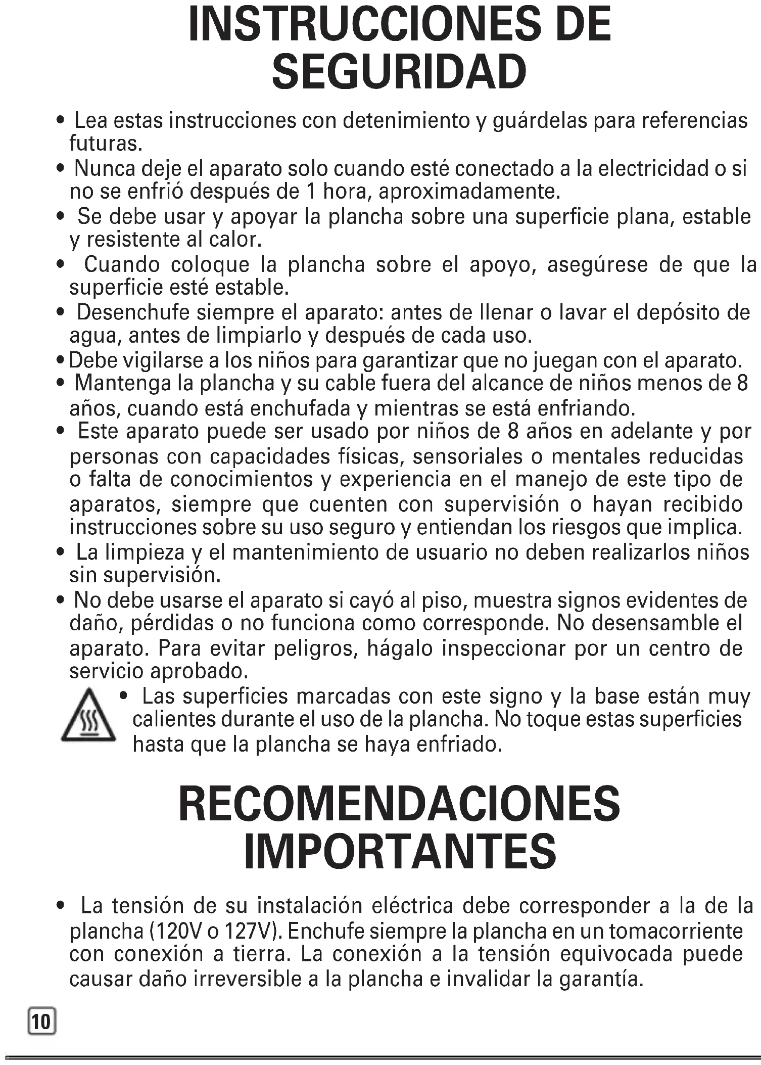 - Las superficies marcadas con este signo y la base están muy calientes durante el uso de la plancha. No toque estas superficies hasta que la plancha se haya enfriado. RECOMENDACIONES IMPORTANTES