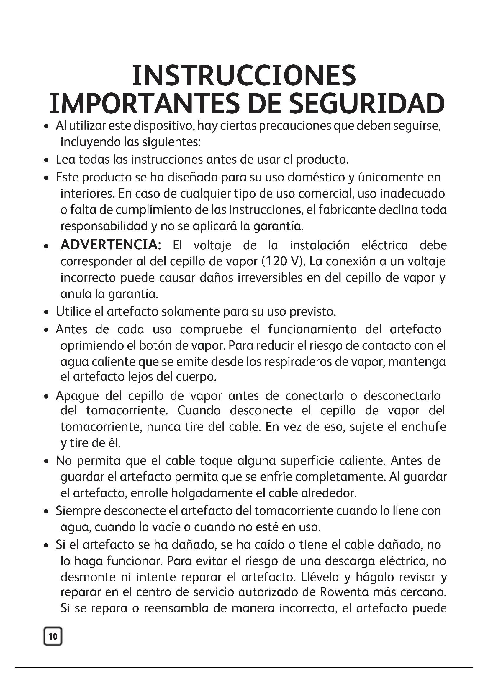 ADVERTENCIA: El voltaje de la instalación eléctrica debe corresponder al del cepillo de vapor (120 V). La conexión a un voltaje incorrecto puede causar daños irreversibles en del cepillo de vapor y anula la garantía.