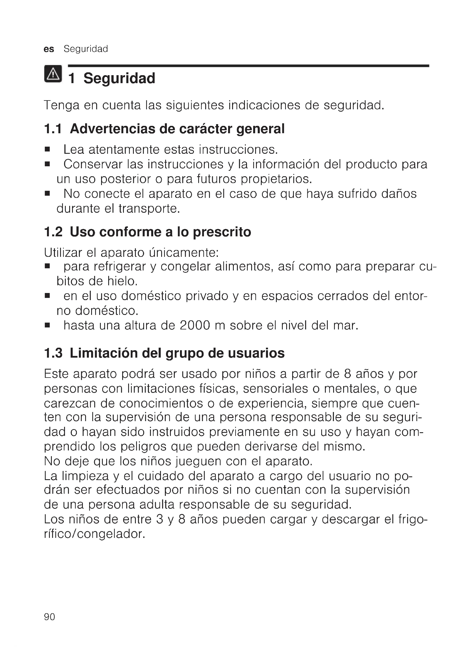 1 Seguridad Tenga en cuenta las siguientes indicaciones de seguridad. 1.1 Advertencias de carácter general ¡ Lea atentamente estas instrucciones. ¡ Conservar las instrucciones y la información del producto para un uso posterior o para futuros propietarios. ¡ No conecte el aparato en el caso de que haya sufrido daños durante el transporte. 1.2 Uso conforme a lo prescrito Utilizar el aparato únicamente: ¡ para refrigerar y congelar alimentos, así como para preparar cu- bitos de hielo. ¡ en el uso doméstico privado y en espacios cerrados del entor- no doméstico. ¡ hasta una altura de 2000m sobre el nivel del mar. 1.3 Limitación del grupo de usuarios Este aparato podrá ser usado por niños a partir de 8 años y por personas con limitaciones físicas, sensoriales o mentales, o que carezcan de conocimientos o de experiencia, siempre que cuen- ten con la supervisión de una persona responsable de su seguri- dad o hayan sido instruidos previamente en su uso y hayan com- prendido los peligros que pueden derivarse del mismo. No deje que los niños jueguen con el aparato. La limpieza y el cuidado del aparato a cargo del usuario no po- drán ser efectuados por niños si no cuentan con la supervisión de una persona adulta responsable de su seguridad. Los niños de entre 3 y 8 años pueden cargar y descargar el frigo- rífico/congelador.Seguridad es