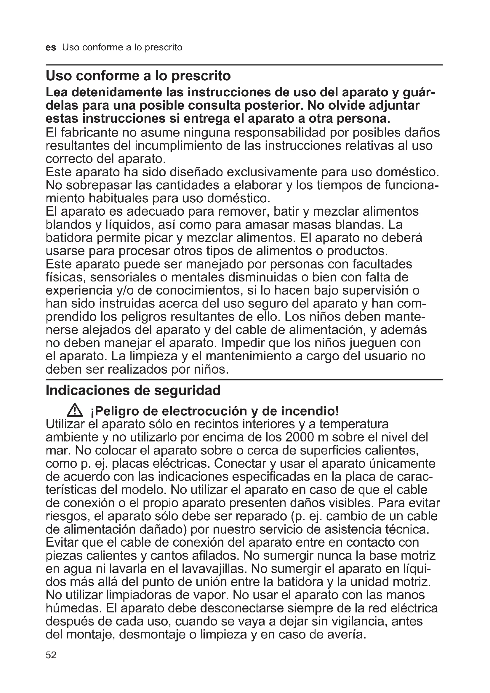 hdot saat myyntiliikkeeltä, josta olet ostanut laitteen. Takuutapauksessa on näytettävä ostokuitti. Oikeus muutoksiin pidätetään.52 es Uso conforme a lo prescrito Uso conforme a lo prescrito Lea detenidamente las instrucciones de uso del aparato y guár- delas para una posible consulta posterior. No olvide adjuntar estas instrucciones si entrega el aparato a otra persona. El fabricante no asume ninguna responsabilidad por posibles daños resultantes del incumplimiento de las instrucciones relativas al uso correcto del aparato. Este aparato ha sido diseñado exclusivamente para uso doméstico. No sobrepasar las cantidades a elaborar y los tiempos de funciona- miento habituales para uso doméstico. El aparato es adecuado para remover, batir y mezclar alimentos blandos y líquidos, así como para amasar masas blandas. La batidora permite picar y mezclar alimentos. El aparato no deberá usarse para procesar otros tipos de alimentos o productos. Este aparato puede ser manejado por personas con facultades físicas, sensoriales o mentales disminuidas o bien con falta de experiencia y/o de conocimientos, si lo hacen bajo supervisión o han sido instruidas acerca del uso seguro del aparato y han com- prendido los peligros resultantes de ello. Los niños deben mante- nerse alejados del aparato y del cable de alimentación, y además no deben manejar el aparato. Impedir que los niños jueguen con el aparato. La limpieza y el mantenimiento a cargo del usuario no deben ser realizados por niños. Indicaciones de seguridad W ¡Peligro de electrocución y de incendio! Utilizar el aparato sólo en recintos interiores y a temperatura ambiente y no utilizarlo por encima de los 2000 m sobre el nivel del mar. No colocar el aparato sobre o cerca de superficies calientes, como p. ej. placas eléctricas. Conectar y usar el aparato únicamente de acuerdo con las indicaciones especificadas en la placa de carac- terísticas del modelo. No utilizar el aparato en caso de que el cable de conexión o el propio aparato presenten daños visibles. Para evitar riesgos, el aparato sólo debe ser reparado (p. ej. cambio de un cable de alimentación dañado) por nuestro servicio de asistencia técnica. Evitar que el cable de conexión del aparato entre en contacto con piezas calientes y cantos afilados. No sumergir nunca la base motriz en agua ni lavarla en el lavavajillas. No sumergir el aparato en líqui- dos más allá del punto de unión entre la batidora y la unidad motriz. No utilizar limpiadoras de vapor. No usar el aparato con las manos húmedas. El aparato debe desconectarse siempre de la red eléctrica después de cada uso, cuando se vaya a dejar sin vigilancia, antes del montaje, desmontaje o limpieza y en caso de avería.53