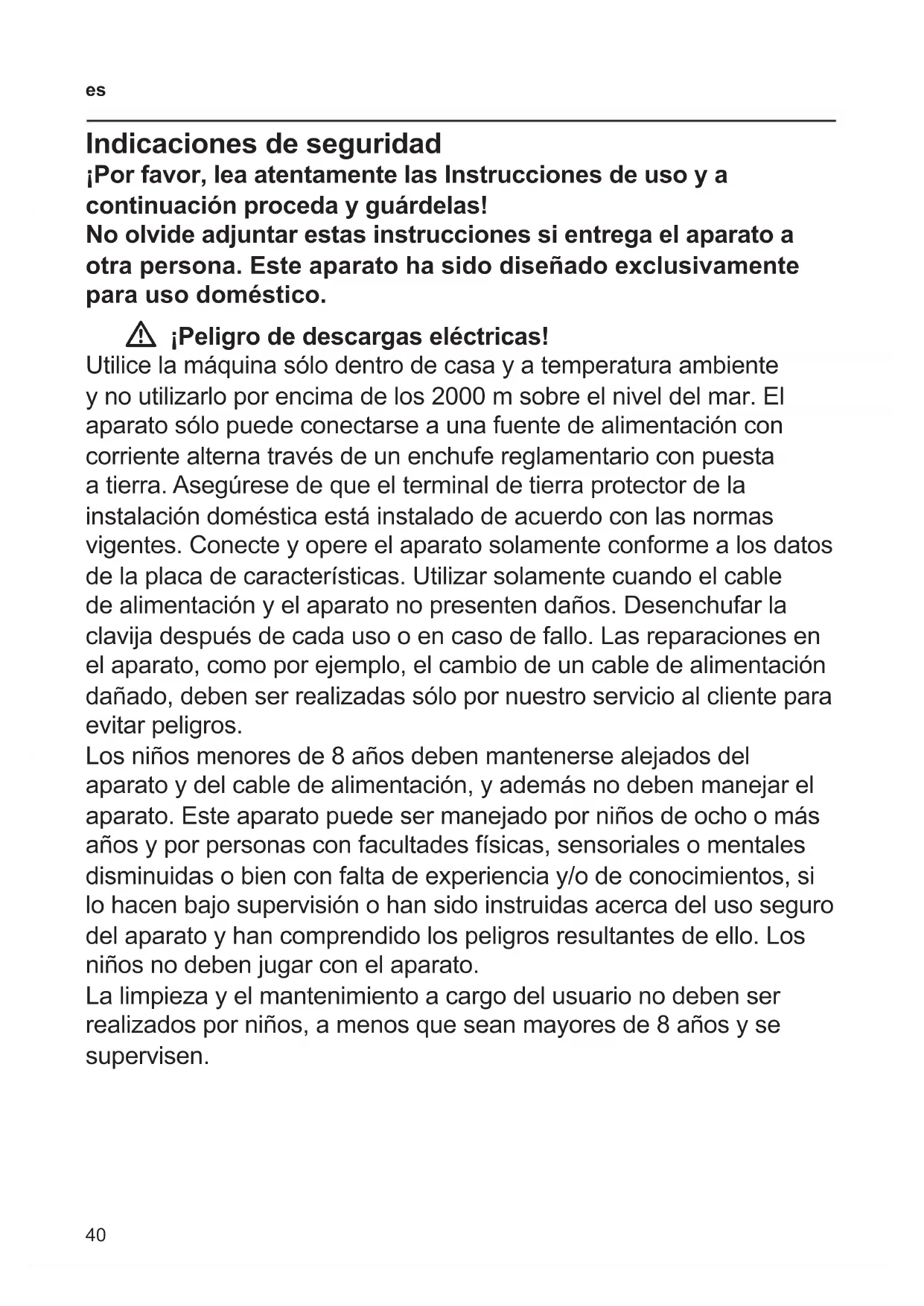 Indicaciones de seguridad ¡Por favor, lea atentamente las Instrucciones de uso y a continuación proceda y guárdelas! No olvide adjuntar estas instrucciones si entrega el aparato a otra persona. Este aparato ha sido diseñado exclusivamente para uso doméstico. W ¡Peligro de descargas eléctricas! Utilice la máquina sólo dentro de casa y a temperatura ambiente y no utilizarlo por encima de los 2000 m sobre el nivel del mar. El aparato sólo puede conectarse a una fuente de alimentación con corriente alterna través de un enchufe reglamentario con puesta a tierra. Asegúrese de que el terminal de tierra protector de la instalación doméstica está instalado de acuerdo con las normas vigentes. Conecte y opere el aparato solamente conforme a los datos de la placa de características. Utilizar solamente cuando el cable de alimentación y el aparato no presenten daños. Desenchufar la clavija después de cada uso o en caso de fallo. Las reparaciones en el aparato, como por ejemplo, el cambio de un cable de alimentación dañado, deben ser realizadas sólo por nuestro servicio al cliente para evitar peligros. Los niños menores de 8 años deben mantenerse alejados del aparato y del cable de alimentación, y además no deben manejar el aparato. Este aparato puede ser manejado por niños de ocho o más años y por personas con facultades físicas, sensoriales o mentales disminuidas o bien con falta de experiencia y/o de conocimientos, si lo hacen bajo supervisión o han sido instruidas acerca del uso seguro del aparato y han comprendido los peligros resultantes de ello. Los niños no deben jugar con el aparato. La limpieza y el mantenimiento a cargo del usuario no deben ser realizados por niños, a menos que sean mayores de 8 años y se supervisen.41