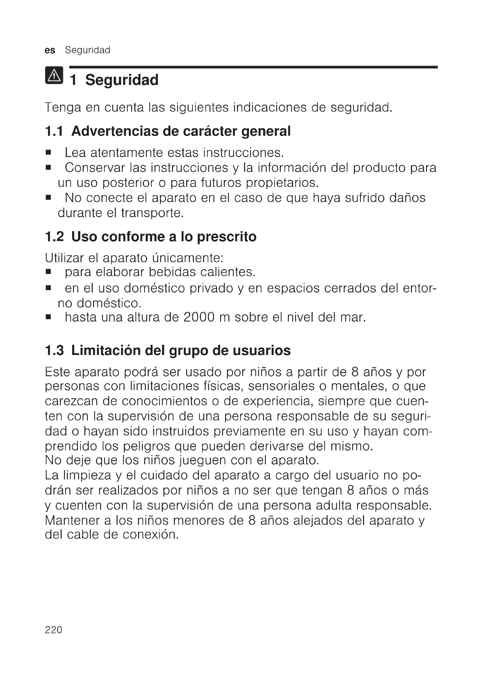 1 Seguridad Tenga en cuenta las siguientes indicaciones de seguridad. 1.1 Advertencias de carácter general ¡ Lea atentamente estas instrucciones. ¡ Conservar las instrucciones y la información del producto para un uso posterior o para futuros propietarios. ¡ No conecte el aparato en el caso de que haya sufrido daños durante el transporte. 1.2 Uso conforme a lo prescrito Utilizar el aparato únicamente: ¡ para elaborar bebidas calientes. ¡ en el uso doméstico privado y en espacios cerrados del entor- no doméstico. ¡ hasta una altura de 2000msobre el nivel del mar. 1.3 Limitación del grupo de usuarios Este aparato podrá ser usado por niños a partir de 8 años y por personas con limitaciones físicas, sensoriales o mentales, o que carezcan de conocimientos o de experiencia, siempre que cuen- ten con la supervisión de una persona responsable de su seguri- dad o hayan sido instruidos previamente en su uso y hayan com- prendido los peligros que pueden derivarse del mismo. No deje que los niños jueguen con el aparato. La limpieza y el cuidado del aparato a cargo del usuario no po- drán ser realizados por niños a no ser que tengan 8 años o más y cuenten con la supervisión de una persona adulta responsable. Mantener a los niños menores de 8 años alejados del aparato y del cable de conexión.Seguridad es