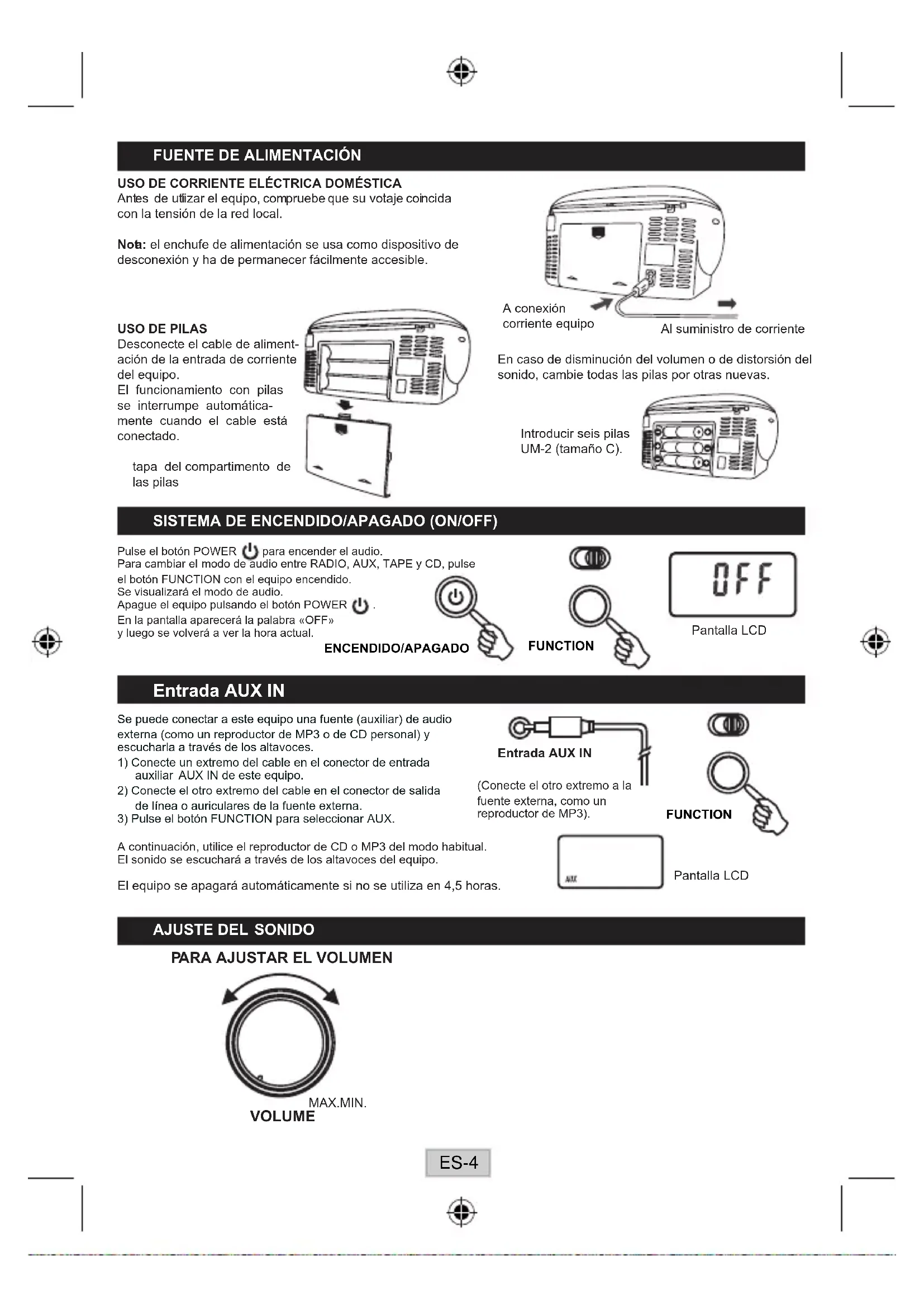 A continuación, utilice el reproductor de CD o MP3 del modo habitual. El sonido se escuchará a través de los altavoces del equipo. (Conecte el otro extremo a la fuente externa, como un reproductor de MP3). Elequiposeapagaráautomáticamentesinoseutilizaen4,5horas. AJUSTE DEL SONIDO