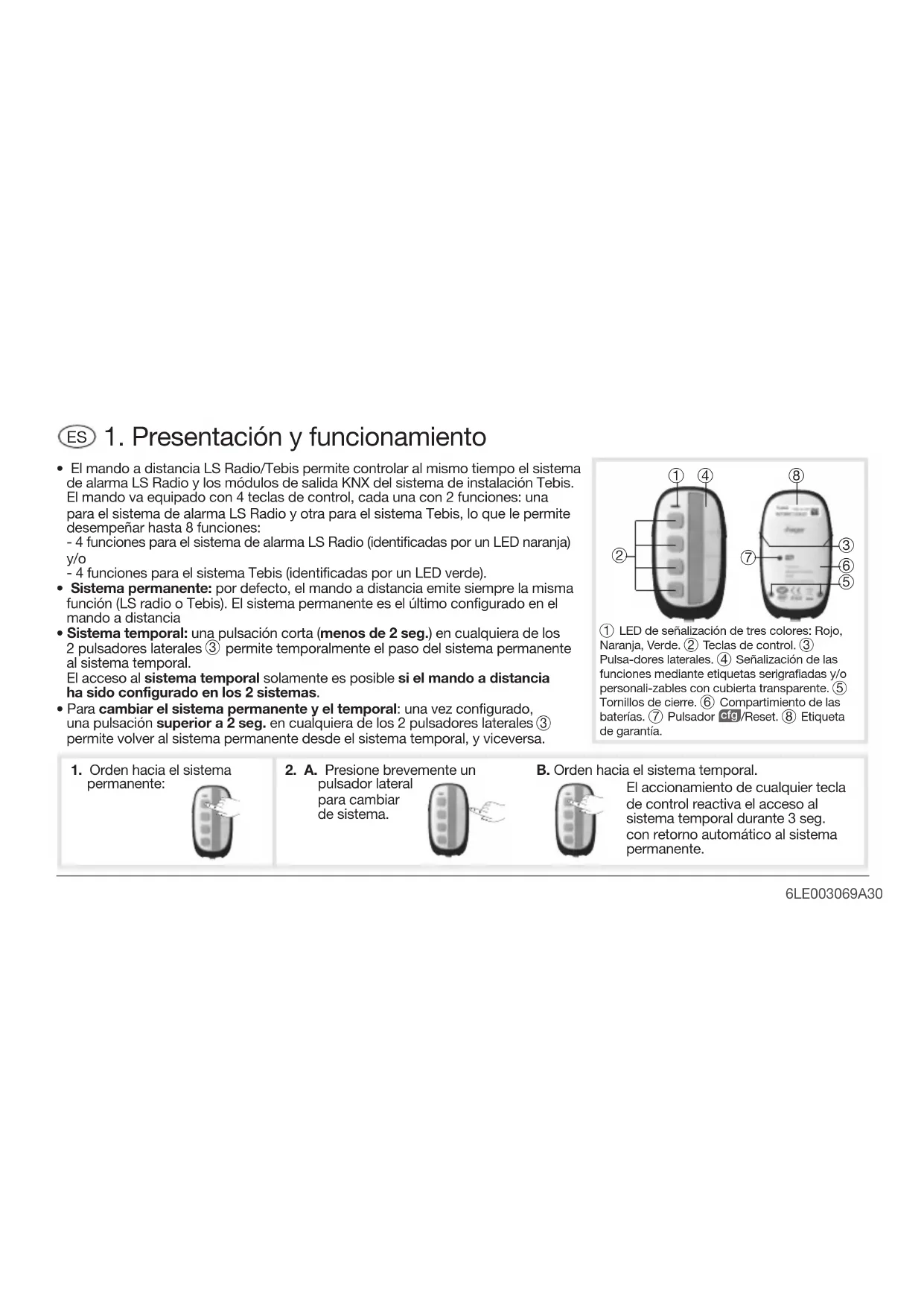 - Sistema temporal: una pulsación corta (menos de 2 seg.) en cualquiera de los 2 pulsadores laterales permite temporalmente el paso del sistema permanente al sistema temporal.