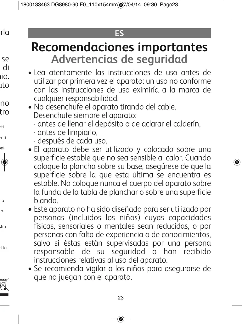 - Lea atentamente las instrucciones de uso antes de utilizar por primera vez el aparato: un uso no conforme con las instrucciones de uso eximiría a la marca de cualquier responsabilidad.