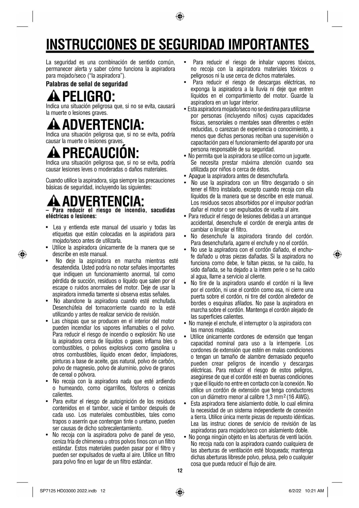 La seguridad es una combinación de sentido común, permanecer alerta y saber cómo funciona la aspiradora para mojado/seco (“la aspiradora”). Palabras de señal de seguridad PELIGRO: Indica una situación peligrosa que, si no se evita, causará la muerte o lesiones graves. ADVERTENCIA: Indica una situación peligrosa que, si no se evita, podría causar la muerte o lesiones graves. PRECAUCIÓN: Indica una situación peligrosa que, si no se evita, podría causar lesiones leves o moderadas o daños materiales. Cuando utilice la aspiradora, siga siempre las precauciones básicas de seguridad, incluyendo las siguientes: ADVERTENCIA: – Para reducir el riesgo de incendio, sacudidas eléctricas o lesiones: