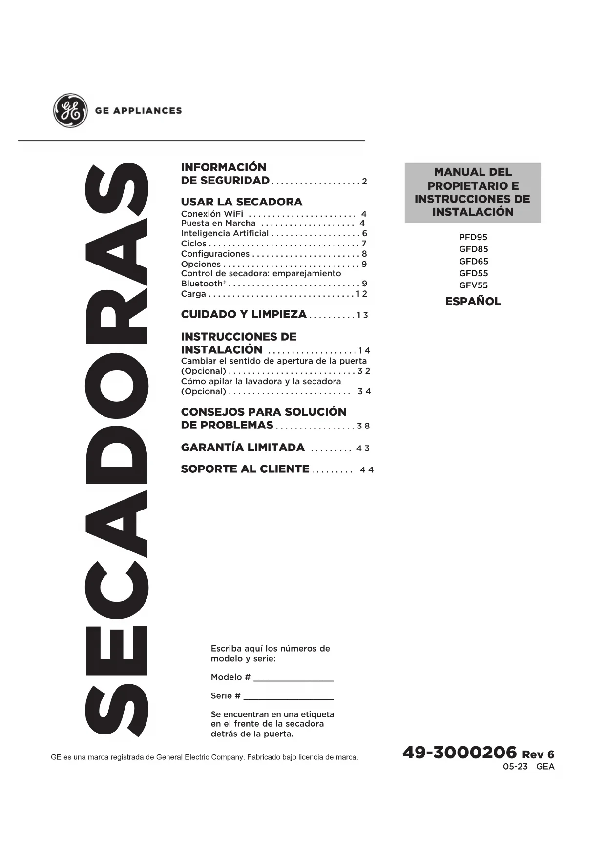 Escriba aquí los números de modelo y serie: Modelo # ________________ Serie # __________________ Se encuentran en una etiqueta en el frente de la secadora detrás de la puerta. MANUAL DEL PROPIETARIO E INSTRUCCIONES DE INSTALACIÓN PFD95 GFD85 GFD65 GFD55 GFV55 ESPAÑOL 49-3000206 Rev 62 49-3000206 Rev 6