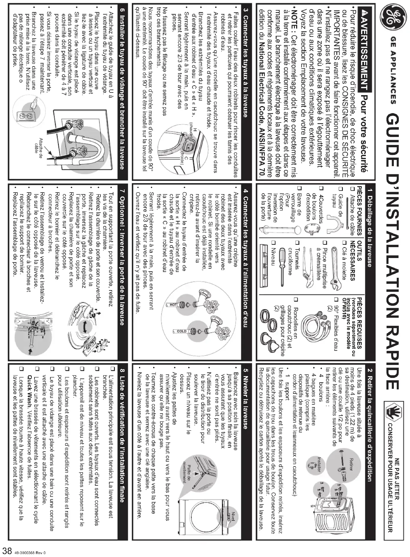- Enchufe la lavadora en un tomacorriente con conexión a tierra. No utilice un cable de extensión ni un adaptador de enchufe. 7 Opcional: Invertir la apertura de la puerta de la lavadora 8 Lista final de verificación de la instalación GUÍA DE INSTALACIÓN RÁPIDA NO LA DESECHE GUÁRDELA PARA USO FUTURO STOP Barra de bloqueo (para invertir el sentido de apertura de la puerta)RetirarInstalarAttache de câble• Si desea invertir la puerta, realice el paso 7 ahora. La alimentación principal debe estar encendida. La lavadora debe estar enchufada. Los grifos deben estar abiertos. Las mangueras de agua deben estar conectadas de forma segura, sin fugas en ambos extremos. La unidad debe estar nivelada y todas las patas deben estar en el suelo. Los pernos de transporte y los separadores se deben retirar y almacenar para usarlos en el futuro. La manguera de drenaje debe estar colocada en la tina de lavado o en el tubo vertical y fijada con un sujetacables. Lave una carga de ropa utilizando el ciclo Quick Wash (Lavado rápido). Verifique si hay fugas. Cuando la carga gire a alta velocidad, asegúrese de que la lavadora y las patas de nivelación estén estables.• Mientras mantiene la puerta abierta, retire los tornillos de la bisagra. Retire la bisagra y la tapa de la puerta.• Retire el conjunto de la traba de la puerta, invierta la traba y vuelva a colocar el conjunto en el lado opuesto.• Vuelva a colocar la bisagra de la puerta y la tapa en el lado opuesto.• Retire el soporte del terminal y desconecte el conector de la clavija.• Retire el conjunto de bloqueo e instálelo en el lado opuesto.• Vuelva a conectar el conector de la clavija y vuelva a colocar el soporte.• Reemplace el conjunto de la puerta. Niv