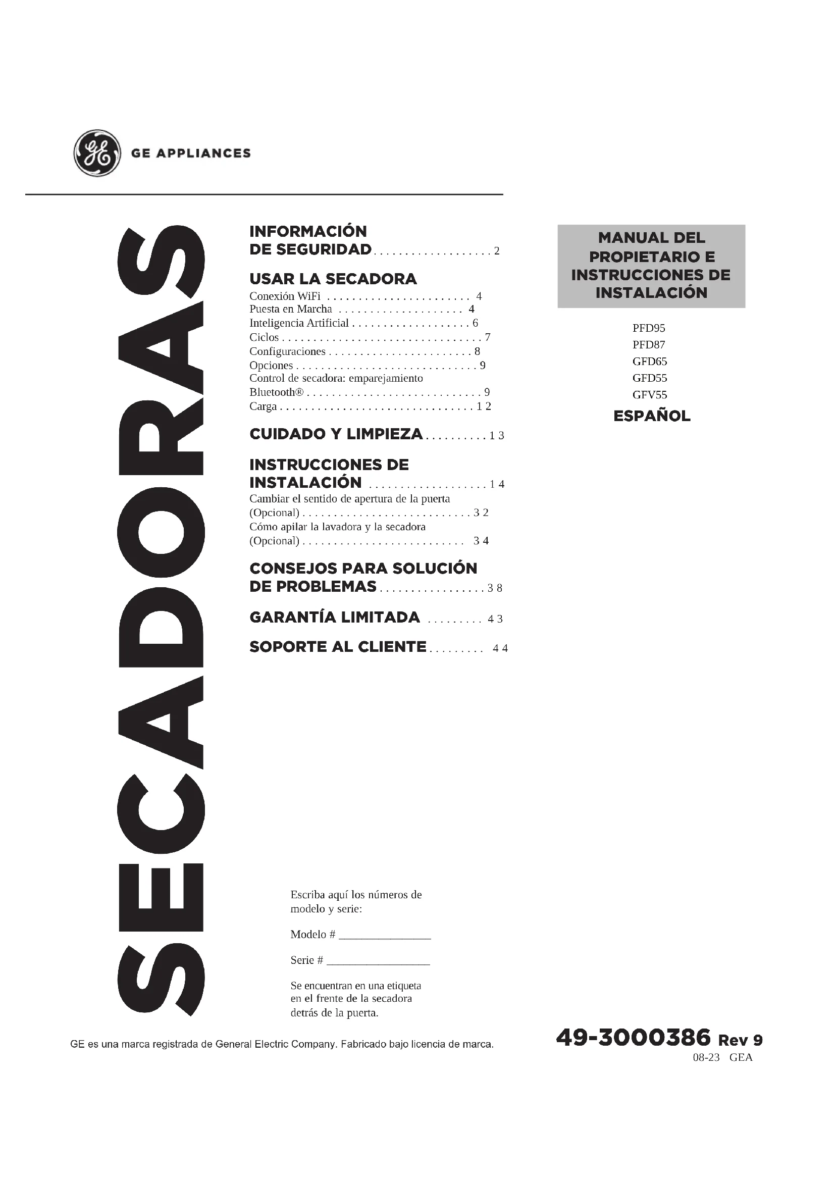 Escriba aquí los números de modelo y serie: Modelo # ________________ Serie # __________________ Se encuentran en una etiqueta en el frente de la secadora detrás de la puerta. MANUAL DEL PROPIETARIO E INSTRUCCIONES DE INSTALACIÓN PFD95 PFD87 GFD65 GFD55 GFV55 ESPAÑOL 49-3000386 Rev 92 49-3000386 Rev 0