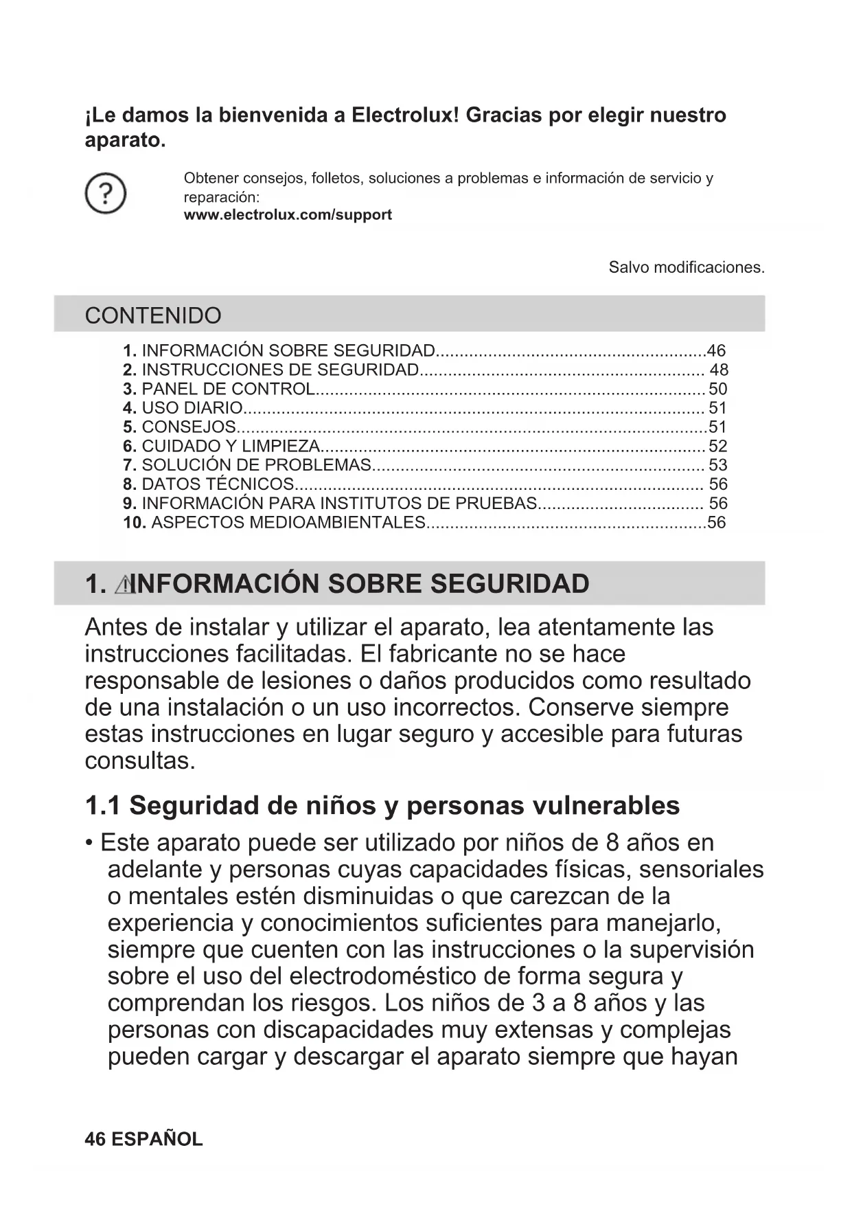 - Este aparato puede ser utilizado por niños de 8 años en adelante y personas cuyas capacidades físicas, sensoriales o mentales estén disminuidas o que carezcan de la experiencia y conocimientos suficientes para manejarlo, siempre que cuenten con las instrucciones o la supervisión sobre el uso del electrodoméstico de forma segura y comprendan los riesgos. Los niños de 3 a 8 años y las personas con discapacidades muy extensas y complejas pueden cargar y descargar el aparato siempre que hayan 46 ESPAÑOLsido debidamente instruidos. Es necesario mantener alejados del aparato a los niños de menos de 3 años salvo que estén bajo supervisión continua.