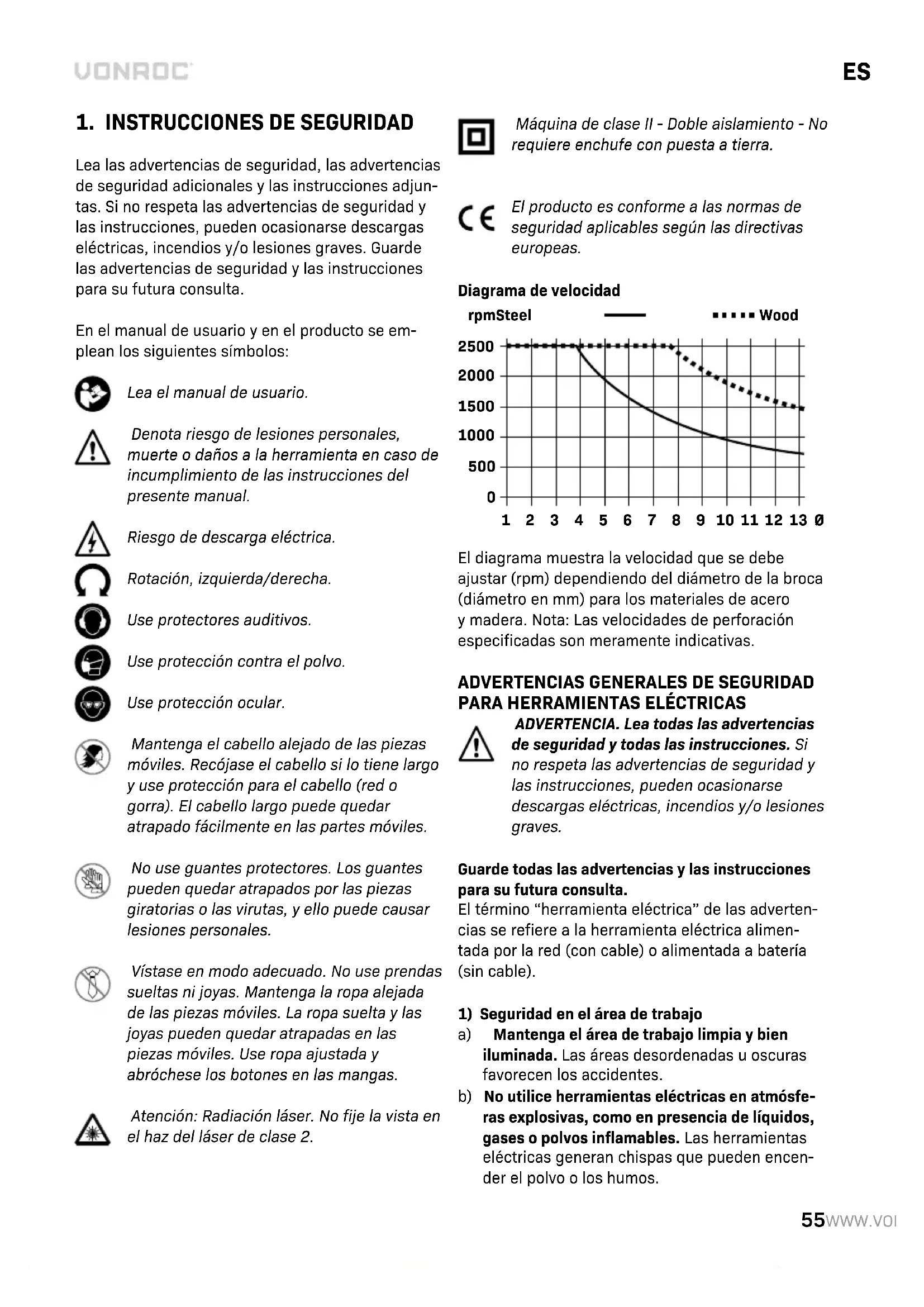 Lea las advertencias de seguridad, las advertencias de seguridad adicionales y las instrucciones adjun- tas. Si no respeta las advertencias de seguridad y las instrucciones, pueden ocasionarse descargas eléctricas, incendios y/o lesiones graves. Guarde las advertencias de seguridad y las instrucciones para su futura consulta. En el manual de usuario y en el producto se em- plean los siguientes símbolos: Lea el manual de usuario. Denota riesgo de lesiones personales, muerte o daños a la herramienta en caso de incumplimiento de las instrucciones del presente manual. Riesgo de descarga eléctrica. Rotación, izquierda/derecha. Use protectores auditivos. Use protección contra el polvo. Use protección ocular. Mantenga el cabello alejado de las piezas móviles. Recójase el cabello si lo tiene largo y use protección para el cabello (red o gorra). El cabello largo puede quedar atrapado fácilmente en las partes móviles. No use guantes protectores. Los guantes pueden quedar atrapados por las piezas giratorias o las virutas, y ello puede causar lesiones personales. Vístase en modo adecuado. No use prendas sueltas ni joyas. Mantenga la ropa alejada de las piezas móviles. La ropa suelta y las joyas pueden quedar atrapadas en las piezas móviles. Use ropa ajustada y abróchese los botones en las mangas. Atención: Radiación láser. No fije la vista en el haz del láser de clase 2. Máquina de clase II - Doble aislamiento - No requiere enchufe con puesta a tierra. El producto es conforme a las normas de seguridad aplicables según las directivas europeas. Diagrama de velocidad