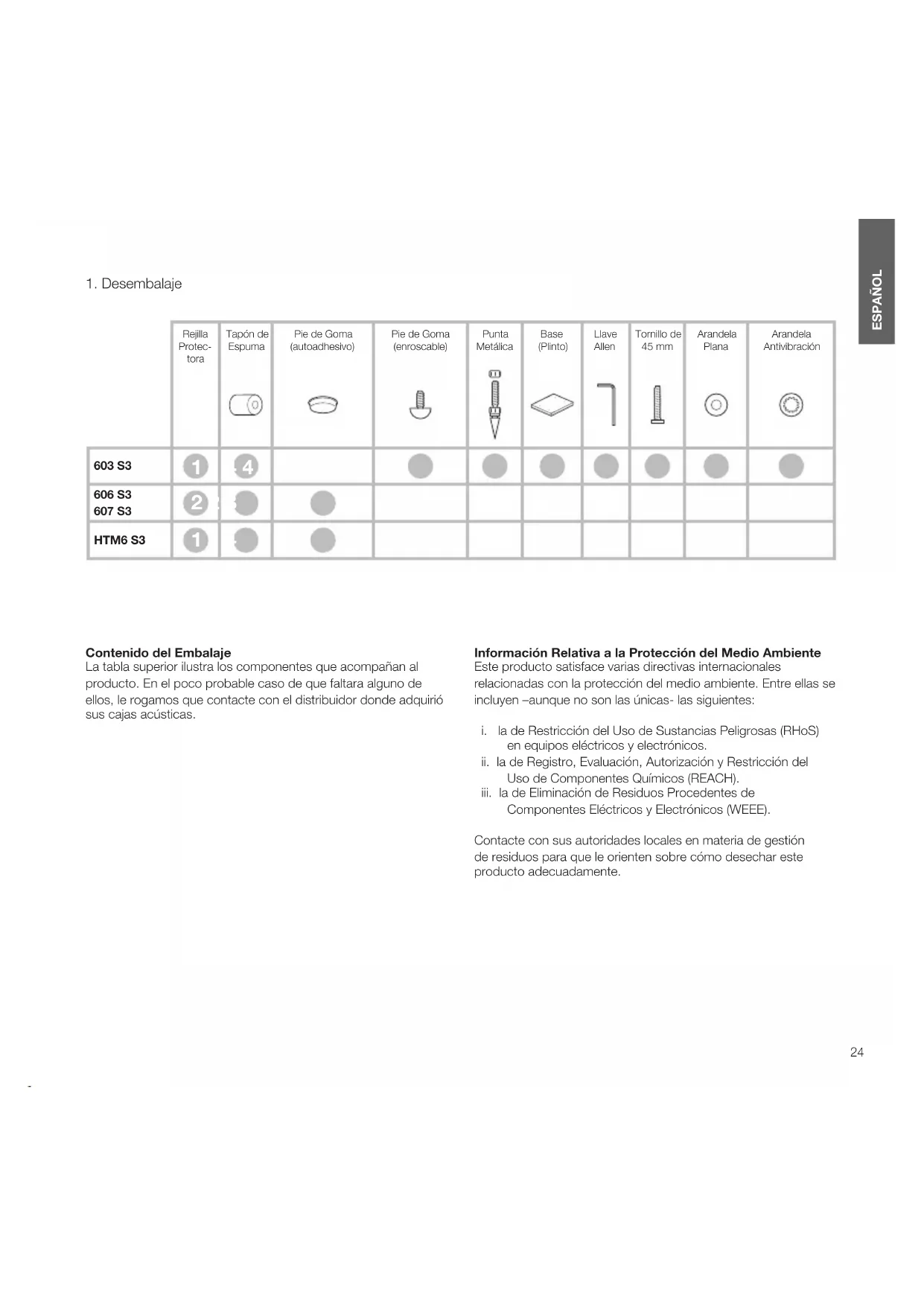ESPAÑOL Contenido del Embalaje La tabla superior ilustra los componentes que acompañan al producto. En el poco probable caso de que faltara alguno de ellos, le rogamos que contacte con el distribuidor donde adquirió sus cajas acústicas. Información Relativa a la Protección del Medio Ambiente Este producto satisface varias directivas internacionales relacionadas con la protección del medio ambiente. Entre ellas se incluyen –aunque no son las únicas- las siguientes:
