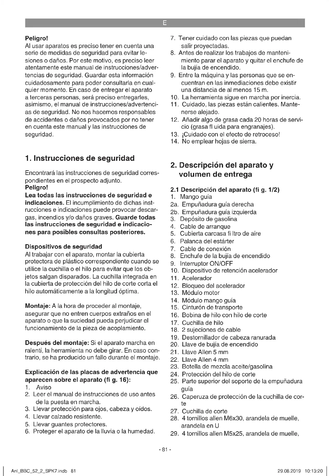 La desbrozadora con motor (uso de la cuchilla de corte) resulta adecuada para cortar madera fi na, hierbajos y maleza. El recortabordes a mo- tor (uso de la bobina de hilo con hilo de corte) resulta adecuado para cortar césped y pequeños hierbajos. La observancia de las instrucciones de uso especifi cadas por el fabricante constituye un requisito indispensable para manejar la máquina de forma adecuada. Cualquier otra utilización que difi era de las que se autorizan expresamente en este manual puede provocar el deterioro del apa- rato y representar un serio peligro para el usuario. Es preciso observar las restricciones indicadas en las advertencias de seguridad. Es preciso tener en consideración que nuestro aparato no está indicado para un uso comercial, industrial o en taller. No asumiremos ningún tipo de garantía cuando se utilice el aparato en zonas industriales, comerciales o talleres, así como acti- vidades similares. ¡Atención! Para evitar que el operario sufra heridas corporales, la desbrozadora con motor de gasolina no se podrá utilizar para realizar los siguientes trabajos: para limpiar aceras, evitan- do asimismo emplearla como trituradora para desmenuzar ramas de árbol o setos. Además, la desbrozadora con motor de gasolina no puede ser utilizada para allanar irregularidades en el suelo como, por ejemplo, los montículos de tierra hechos por los topos. Por motivos de seguridad la desbrozadora con motor de gasolina no puede ser utilizada como unidad motriz para otras her- ramientas o juegos de herramientas de cualquier otro tipo. La máquina sólo debe emplearse para aquellos casos para los que se ha destinado su uso. Cual- quier otro uso no será adecuado. En caso de uso inadecuado, el fabricante no se hace responsable de daños o lesiones de cualquier tipo; el respon- sable es el usuario u operario de la máquina. Anl_BBC_52_2_SPK7.indb 82Anl_BBC_52_2_SPK7.indb 82 29.08.2019 10:13:2029.08.2019 10:13:20E