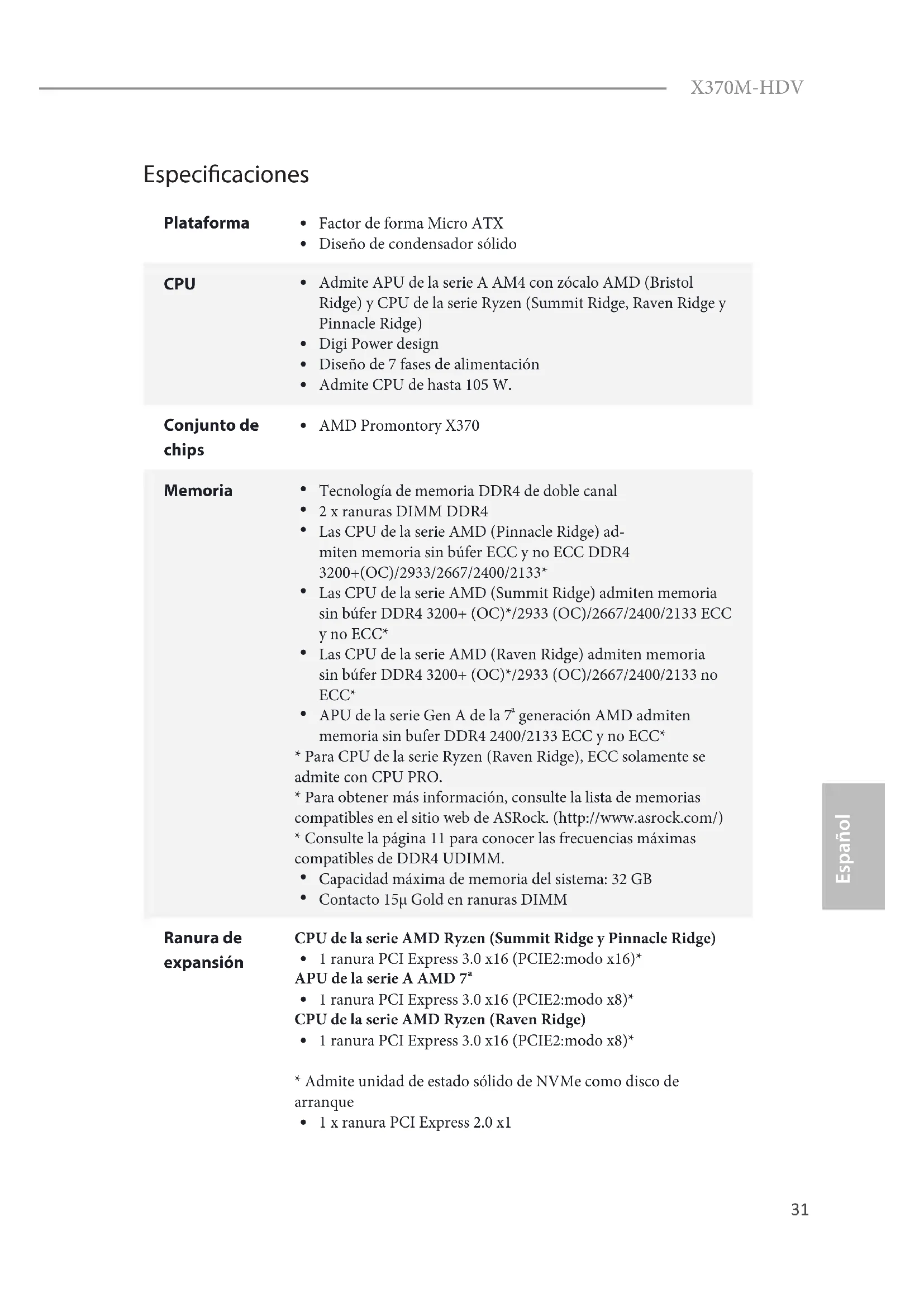 Microso® Windows® 10 64 bit31 Español X370M-HDV Especicaciones Plataforma