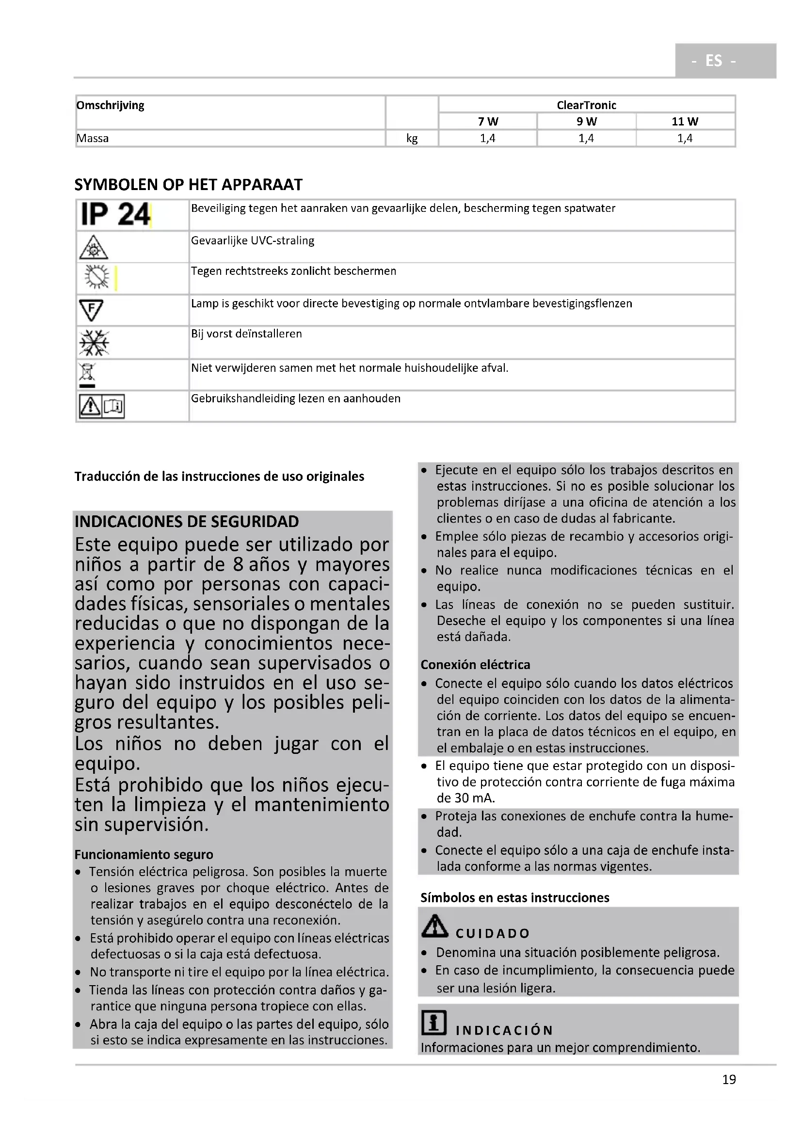 Descripción del funcionamiento La radiación especial de luz del equipo clarificador UVC elimina las algas en suspensión y otros turbios que pro- vocan que el agua se ponga verde. Además se matan las bacterias y los gérmenes. El equipo clarificador UVC se integra en el circuito de agua, de ser posible delante de un filtro. Uso conforme a lo prescrito ClearTronic 7 W / 9 W / 11 Wen lo sucesivo, "el equipo", solo puede utilizarse de la siguiente manera: