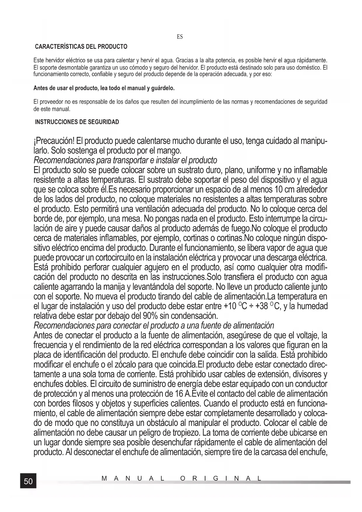 ¡Precaución! El producto puede calentarse mucho durante el uso, tenga cuidado al manipu- larlo. Solo sostenga el producto por el mango. Recomendaciones para transportar e instalar el producto El producto solo se puede colocar sobre un sustrato duro, plano, uniforme y no infl amable resistente a altas temperaturas. El sustrato debe soportar el peso del dispositivo y el agua que se coloca sobre él.Es necesario proporcionar un espacio de al menos 10 cm alrededor de los lados del producto, no coloque materiales no resistentes a altas temperaturas sobre el producto. Esto permitirá una ventilación adecuada del producto. No lo coloque cerca del borde de, por ejemplo, una mesa. No pongas nada en el producto. Esto interrumpe la circu- lación de aire y puede causar daños al producto además de fuego.No coloque el producto cerca de materiales infl amables, por ejemplo, cortinas o cortinas.No coloque ningún dispo- sitivo eléctrico encima del producto. Durante el funcionamiento, se libera vapor de agua que puede provocar un cortocircuito en la instalación eléctrica y provocar una descarga eléctrica. Está prohibido perforar cualquier agujero en el producto, así como cualquier otra modifi - cación del producto no descrita en las instrucciones.Solo transfi era el producto con agua caliente agarrando la manija y levantándola del soporte. No lleve un producto caliente junto con el soporte. No mueva el producto tirando del cable de alimentación.La temperatura en el lugar de instalación y uso del producto debe estar entre +10