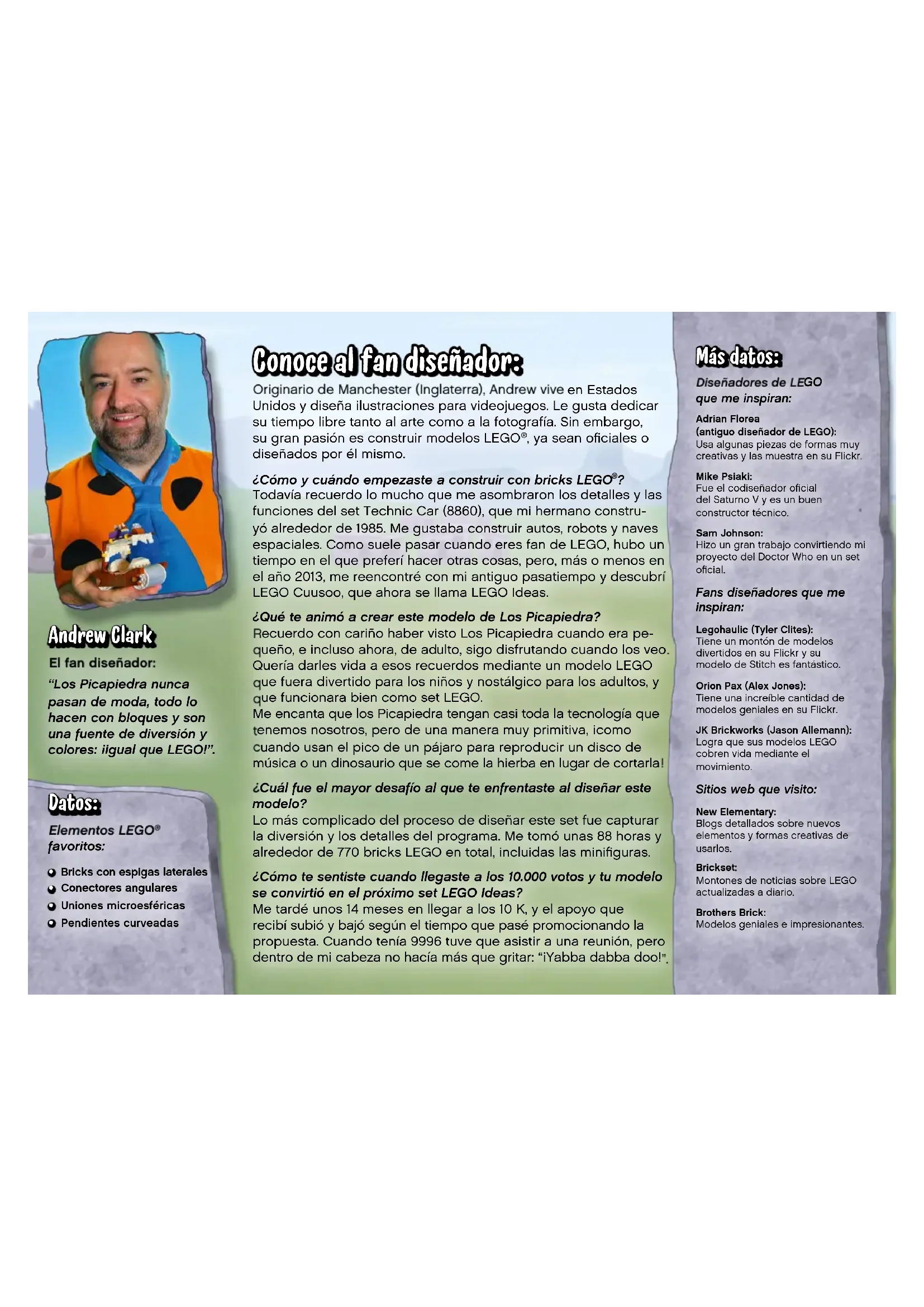 Todavía recuerdo lo mucho que me asombraron los detalles y las funciones del set Technic Car (8860), que mi hermano constru- yó alrededor de 1985. Me gustaba construir autos, robots y naves espaciales. Como suele pasar cuando eres fan de LEGO, hubo un tiempo en el que preferí hacer otras cosas, pero, más o menos en el año 2013, me reencontré con mi antiguo pasatiempo y descubrí LEGO Cuusoo, que ahora se llama LEGO Ideas. ¿Qué te animó a crear este modelo de Los Picapiedra? Recuerdo con cariño haber visto Los Picapiedra cuando era pe- queño, e incluso ahora, de adulto, sigo disfrutando cuando los veo. Quería darles vida a esos recuerdos mediante un modelo LEGO que fuera divertido para los niños y nostálgico para los adultos, y que funcionara bien como set LEGO. Me encanta que los Picapiedra tengan casi toda la tecnología que tenemos nosotros, pero de una manera muy primitiva, ¡como cuando usan el pico de un pájaro para reproducir un disco de música o un dinosaurio que se come la hierba en lugar de cortarla! ¿Cuàl fue el mayor desafío al que te enfrentaste al diseñar este modelo? Lo más complicado del proceso de diseñar este set fue capturar la diversión y los detalles del programa. Me tomó unas 88 horas y alrededor de 770 bricks LEGO en total, incluidas las minifiguras. ¿Cómo te sentiste cuando llegaste a los 10.000 votos y tu modelo se convirtió en el próximo set LEGO Ideas? Me tardé unos 14 meses en llegar a los 10 K, y el apoyo que recibí subió y bajó según el tiempo que pasé promocionando la propuesta. Cuando tenía 9996 tuve que asistir a una reunión, pero dentro de mi cabeza no hacía más que gritar: “¡Yabba dabba doo!”. Diseñadores de LEGO que me inspiran:Adrian Florea (antiguo diseñador de LEGO): Usa algunas piezas de formas muy creativas y las muestra en su Flickr.Mike Psiaki: Fue el codiseñador oficial del Saturno V y es un buen constructor técnico.Sam Johnson: Hizo un gran trabajo convirtiendo mi proyecto del Doctor Who en un set oficial.Fans diseñadores que me inspiran:Legohaulic (Tyler Clites): Tiene un montón de modelos divertidos en su Flickr y su modelo de Stitch es fantástico.Orion Pax (Alex Jones): Tiene una increíble cantidad de modelos geniales en su Flickr. JK Brickworks (Jason Allemann): Logra que sus modelos LEGO cobren vida mediante el movimiento.Sitios web que visito:New Elementary: Blogs detallados sobre nuevos elementos y formas creativas de usarlos.Brickset: Montones de noticias sobre LEGO actualizadas a diario.Brothers Brick: Modelos geniales e impresionantes. El fan diseñador: “Los Picapiedra nunca pasan de moda, todo lo hacen con bloques y son una fuente de diversión y colores: ¡igual que LEGO!”. Elementos LEGO