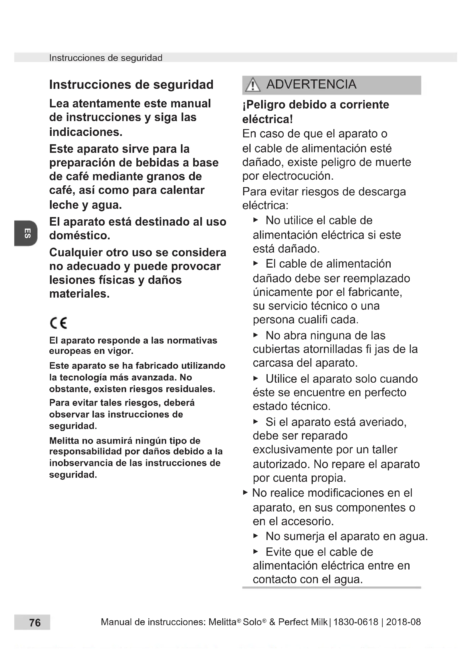 Instrucciones de seguridad Lea atentamente este manual de instrucciones y siga las indicaciones. Este aparato sirve para la preparación de bebidas a base de café mediante granos de café, así como para calentar leche y agua. El aparato está destinado al uso doméstico. Cualquier otro uso se considera no adecuado y puede provocar lesiones físicas y daños materiales. El aparato responde a las normativas europeas en vigor. Este aparato se ha fabricado utilizando la tecnología más avanzada. No obstante, existen riesgos residuales. Para evitar tales riesgos, deberá observar las instrucciones de seguridad. Melitta no asumirá ningún tipo de responsabilidad por daños debido a la inobservancia de las instrucciones de seguridad. ADVERTENCIA ¡Peligro debido a corriente eléctrica! En caso de que el aparato o el cable de alimentación esté dañado, existe peligro de muerte por electrocución. Para evitar riesgos de descarga eléctrica: ▶ No utilice el cable de alimentación eléctrica si este está dañado. ▶ El cable de alimentación dañado debe ser reemplazado únicamente por el fabricante, su servicio técnico o una persona cualifi cada. ▶ No abra ninguna de las cubiertas atornilladas fi jas de la carcasa del aparato. ▶ Utilice el aparato solo cuando éste se encuentre en perfecto estado técnico. ▶ Si el aparato está averiado, debe ser reparado exclusivamente por un taller autorizado. No repare el aparato por cuenta propia. ▶ No realice modifi caciones en el aparato, en sus componentes o en el accesorio. ▶ No sumerja el aparato en agua. ▶ Evite que el cable de alimentación eléctrica entre en contacto con el agua.Manual de instrucciones: Melitta