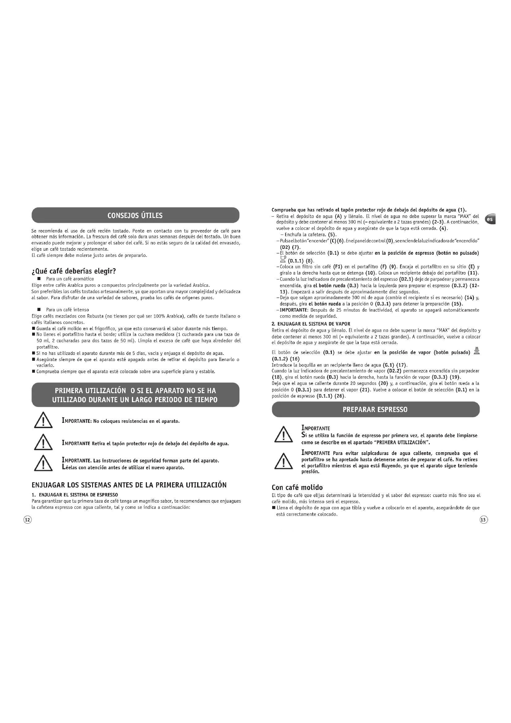Retira el depósito de agua y llénalo. El nivel de agua no debe superar la marca “MAX” del depósito y debe contener al menos 300 ml (= equivalente a 2 tazas grandes). A continuación, vuelve a colocar el depósito de agua y asegúrate de que la tapa está cerrada. El botón de selección (D.1) se debe ajustar en la posición de vapor (botón pulsado) (D.1.2) (16) Introduce la boquilla en un recipiente lleno de agua (G.1) (17). Cuando la luz indicadora de precalentamiento de vapor (D2.2) permanezca encendida sin parpadear (18), gira el botón rueda (D.3) hacia la derecha, hasta la función de vapor (D.3.3) (19). Deja que el agua se caliente durante 20 segundos (20) y, a continuación, gira el botón rueda a la posición O (D.3.1) para detener el vapor (21). Vuelve a colocar el botón de selección (D.1) en la posición de espresso (D.1.1) (26). CONSEJOS ÚTILES Se recomienda el uso de café recién tostado. Ponte en contacto con tu proveedor de café para obtener más información. La frescura del café solo dura unas semanas después del tostado. Un buen envasado puede mejorar y prolongar el sabor del café. Si no estás seguro de la calidad del envasado, elige un café tostado recientemente. El café siempre debe molerse justo antes de prepararlo. ¿Qué café deberías elegir? Para un café aromático Elige entre cafés Arabica puros o compuestos principalmente por la variedad Arabica. Son preferibles los cafés tostados artesanalmente, ya que aportan una mayor complejidad y delicadeza al sabor. Para disfrutar de una variedad de sabores, prueba los cafés de orígenes puros. Para un café intenso Elige cafés mezclados con Robusta (no tienen por qué ser 100% Arabica), cafés de tueste italiano o cafés italianos concretos. Guarda el café molido en el frigorífico, ya que esto conservará el sabor durante más tiempo. No llenes el portafiltro hasta el borde; utiliza la cuchara medidora (1 cucharada para una taza de 50 ml, 2 cucharadas para dos tazas de 50 ml). Limpia el exceso de café que haya alrededor del portafiltro. Si no has utilizado el aparato durante más de 5 días, vacía y enjuaga el depósito de agua. Asegúrate siempre de que el aparato esté apagado antes de retirar el depósito para llenarlo o vaciarlo. Comprueba siempre que el aparato esté colocado sobre una superficie plana y estable. PRIMERA UTILIZACIÓN O SI EL APARATO NO SE HA UTILIZADO DURANTE UN LARGO PERIODO DE TIEMPO IMPORTANTE: No coloques resistencias en el aparato. IMPORTANTE Retira el tapón protector rojo de debajo del depósito de agua. IMPORTANTE. Las instrucciones de seguridad forman parte del aparato. Léelas con atención antes de utilizar el nuevo aparato. ENJUAGAR LOS SISTEMAS ANTES DE LA PRIMERA UTILIZACIÓN