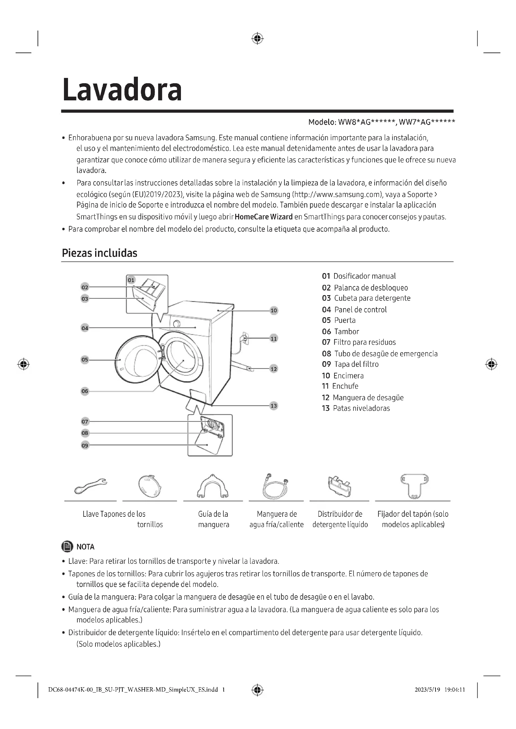 - Enhorabuena por su nueva lavadora Samsung. Este manual contiene información importante para la instalación, el uso y el mantenimiento del electrodoméstico. Lea este manual detenidamente antes de usar la lavadora para garantizar que conoce cómo utilizar de manera segura y eficiente las características y funciones que le ofrece su nueva lavadora.