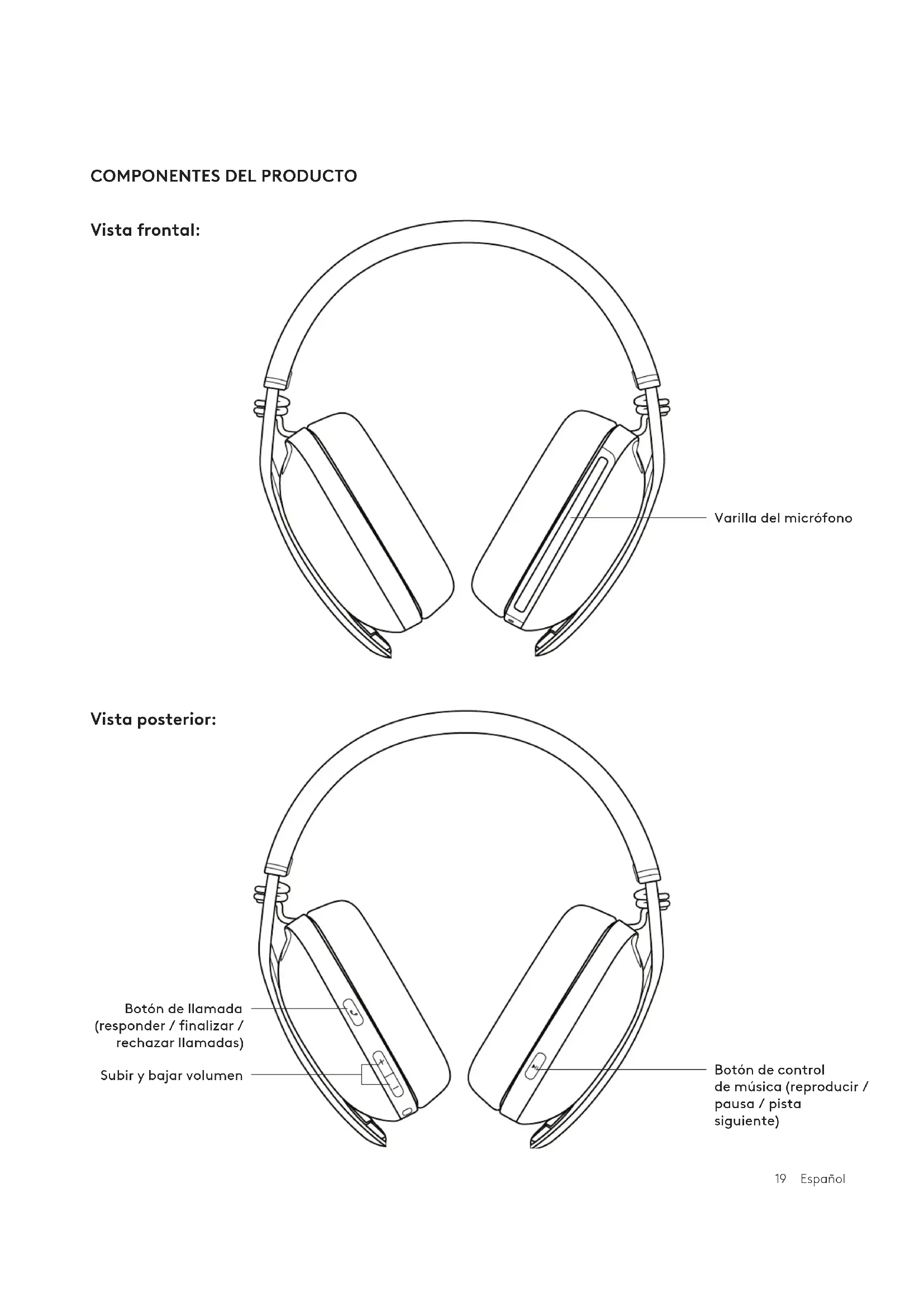 losauriculares puestos. Desliza las copas hacia arriba y hacia abajo en la diadema hasta que lasnotes cómodamente asentadas sobre las orejas. 22EspañolCONTROLES DE LOS AURICULARES Nota: - Las funciones de control multimedia dependen del tipo de aplicación. - Las actividades de llamada son siempre la primera prioridad. Cuando haya dos dispositivos Bluetooth