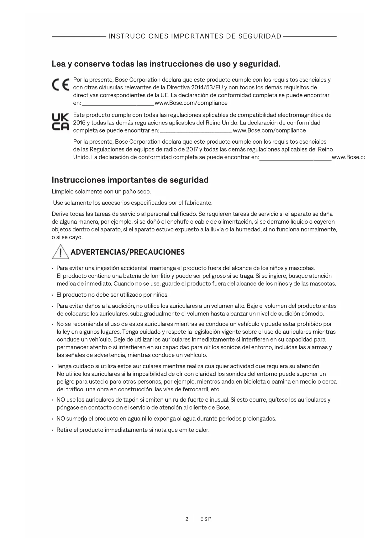 ESP Lea y conserve todas las instrucciones de uso y seguridad. Por la presente, Bose Corporation declara que este producto cumple con los requisitos esenciales y con otras cláusulas relevantes de la Directiva 2014/53/EU y con todos los demás requisitos de directivas correspondientes de la UE. La declaración de conformidad completa se puede encontrar en: www.Bose.com/compliancewww.Bose.com/compliance Este producto cumple con todas las regulaciones aplicables de compatibilidad electromagnética de 2016 y todas las demás regulaciones aplicables del Reino Unido. La declaración de conformidad completa se puede encontrar en: www.Bose.com/compliancewww.Bose.com/compliance Por la presente, Bose Corporation declara que este producto cumple con los requisitos esenciales de las Regulaciones de equipos de radio de 2017 y todas las demás regulaciones aplicables del Reino Unido. La declaración de conformidad completa se puede encontrar en: www.Bose.com/compliancewww.Bose.com/compliance Instrucciones importantes de seguridad Límpielo solamente con un paño seco. Use solamente los accesorios especificados por el fabricante. Derive todas las tareas de servicio al personal calificado. Se requieren tareas de servicio si el aparato se daña de alguna manera, por ejemplo, si se dañó el enchufe o cable de alimentación, si se derramó líquido o cayeron objetos dentro del aparato, si el aparato estuvo expuesto a la lluvia o la humedad, si no funciona normalmente, o si se cayó. ADVERTENCIAS/PRECAUCIONES