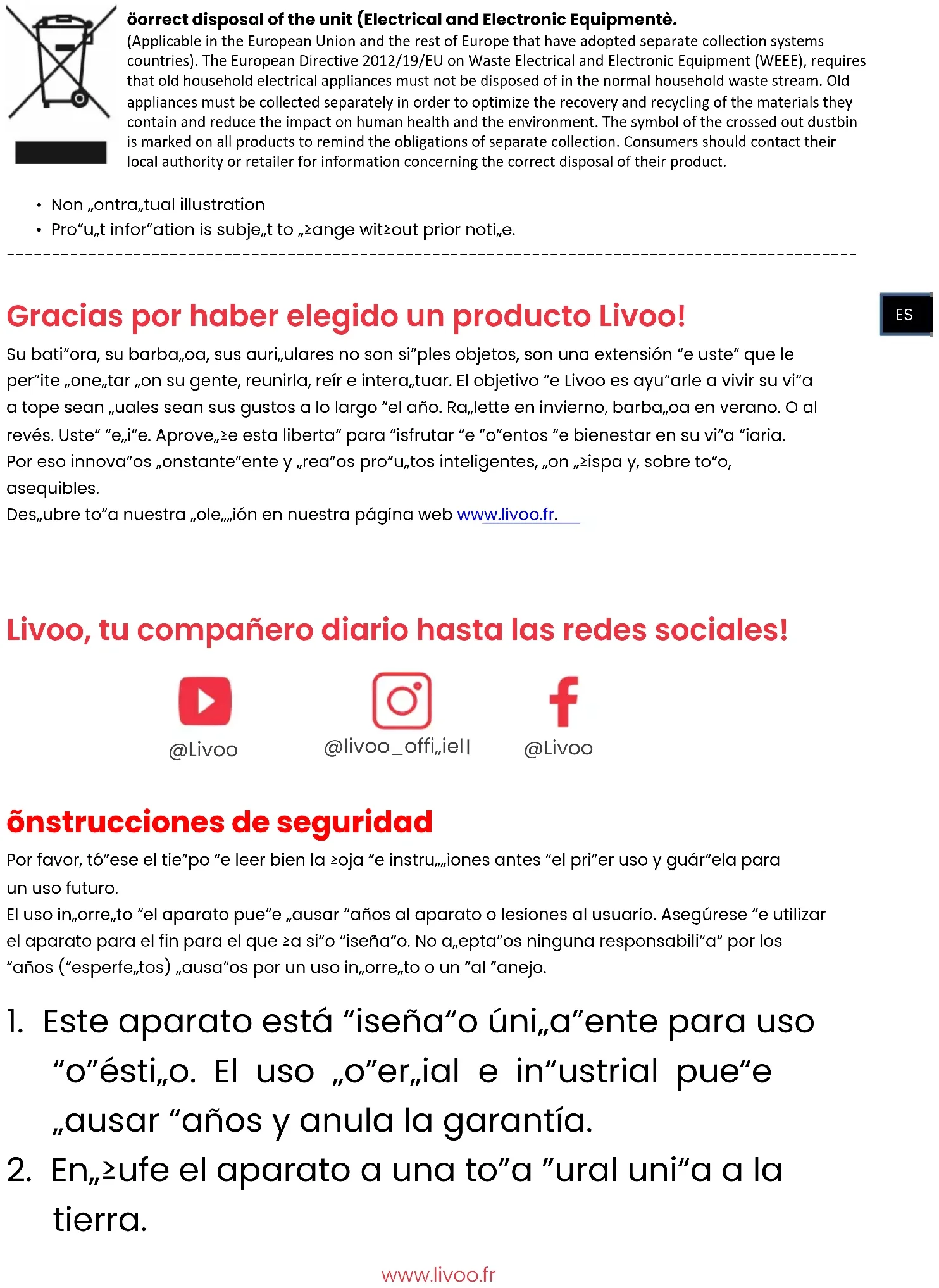 Gracias por haber elegido un producto Livoo! Su batidora, su barbacoa, sus auriculares no son simples objetos, son una extensión de usted que le permite conectar con su gente, reunirla, reír e interactuar. El objetivo de Livoo es ayudarle a vivir su vida a tope sean cuales sean sus gustos a lo largo del año. Raclette en invierno, barbacoa en verano. O al revés. Usted decide. Aproveche esta libertad para disfrutar de momentos de bienestar en su vida diaria. Por eso innovamos constantemente y creamos productos inteligentes, con chispa y, sobre todo, asequibles. Descubre toda nuestra colección en nuestra página web www.livoo.fr.