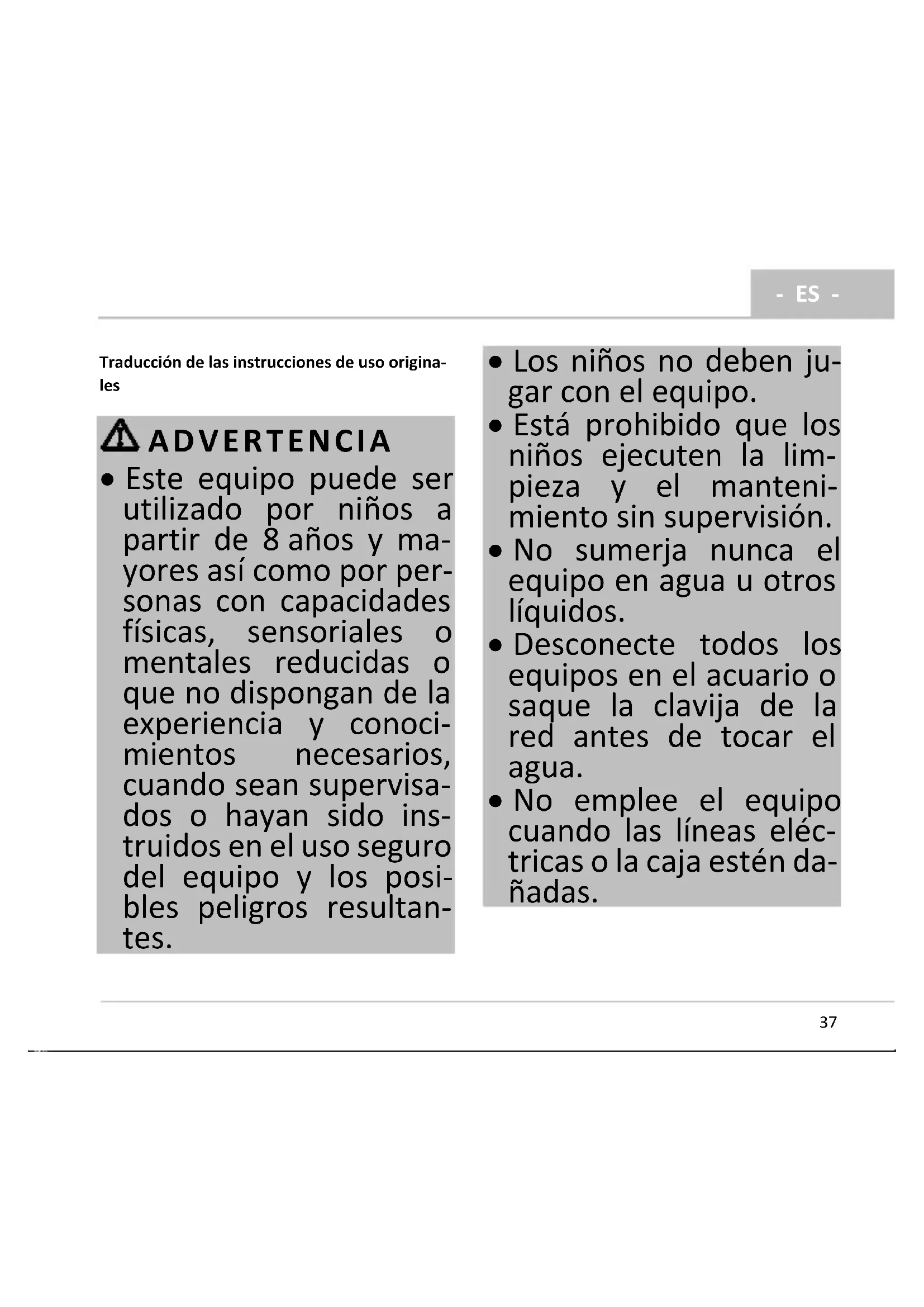 - No emplee el equipo cuando las líneas eléc- tricas o la caja estén da- ñadas.- ES -