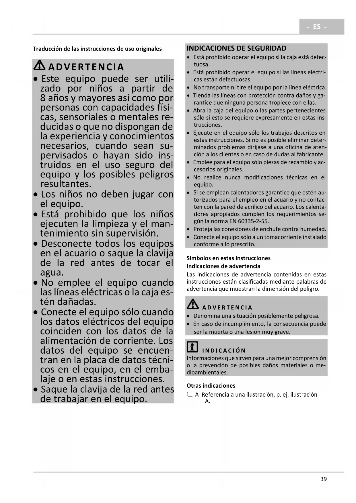 - Si se emplean calentadores garantice que estén au- torizados para el empleo en el acuario y no contac- ten con la pared de acrílico del acuario. Los calenta- dores apropiados cumplen los requerimientos se- gún la norma EN 60335-2-55.