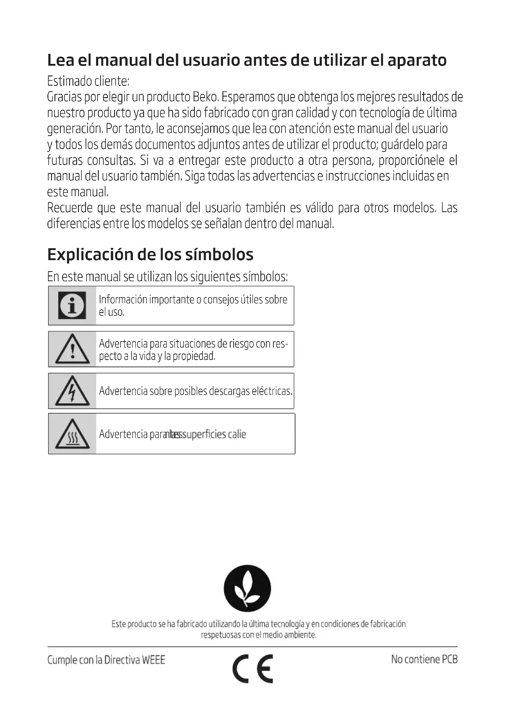 for use in open luminare.Range Hood / User Manual 19 / 59 EN 7 Warranty Warranty Statement For Beko Range Hoods Beko Beko Beko Beko Beko Beko Please visit our site www.beko.us for necessary contact number to schedule a service appointment and parts purchase. BEKO BEKO otherwise 2 year* limited warranty from date of first installation Beko will repair or replace at no cost to the consumer any defectiveLea el manual del usuario antes de utilizar el aparato Estimado cliente: Gracias por elegir un producto Beko. Esperamos que obtenga los mejores resultados de nuestro producto ya que ha sido fabricado con gran calidad y con tecnología de última generación. Por tanto, le aconsejamos que lea con atención este manual del usuario y todos los demás documentos adjuntos antes de utilizar el producto; guárdelo para futuras consultas. Si va a entregar este producto a otra persona, proporciónele el manual del usuario también. Siga todas las advertencias e instrucciones incluidas en este manual. Recuerde que este manual del usuario también es válido para otros modelos. Las diferencias entre los modelos se señalan dentro del manual. Explicación de los símbolos En este manual se utilizan los siguientes símbolos: Información importante o consejos útiles sobre el uso. Advertencia para situaciones de riesgo con res- pecto a la vida y la propiedad. Advertencia sobre posibles descargas eléctricas. Advertencia par ntes.Campana / Manual del usuario 21 / 59 ES ÍNDICE 1 Lea y guarde estas instrucciones 22