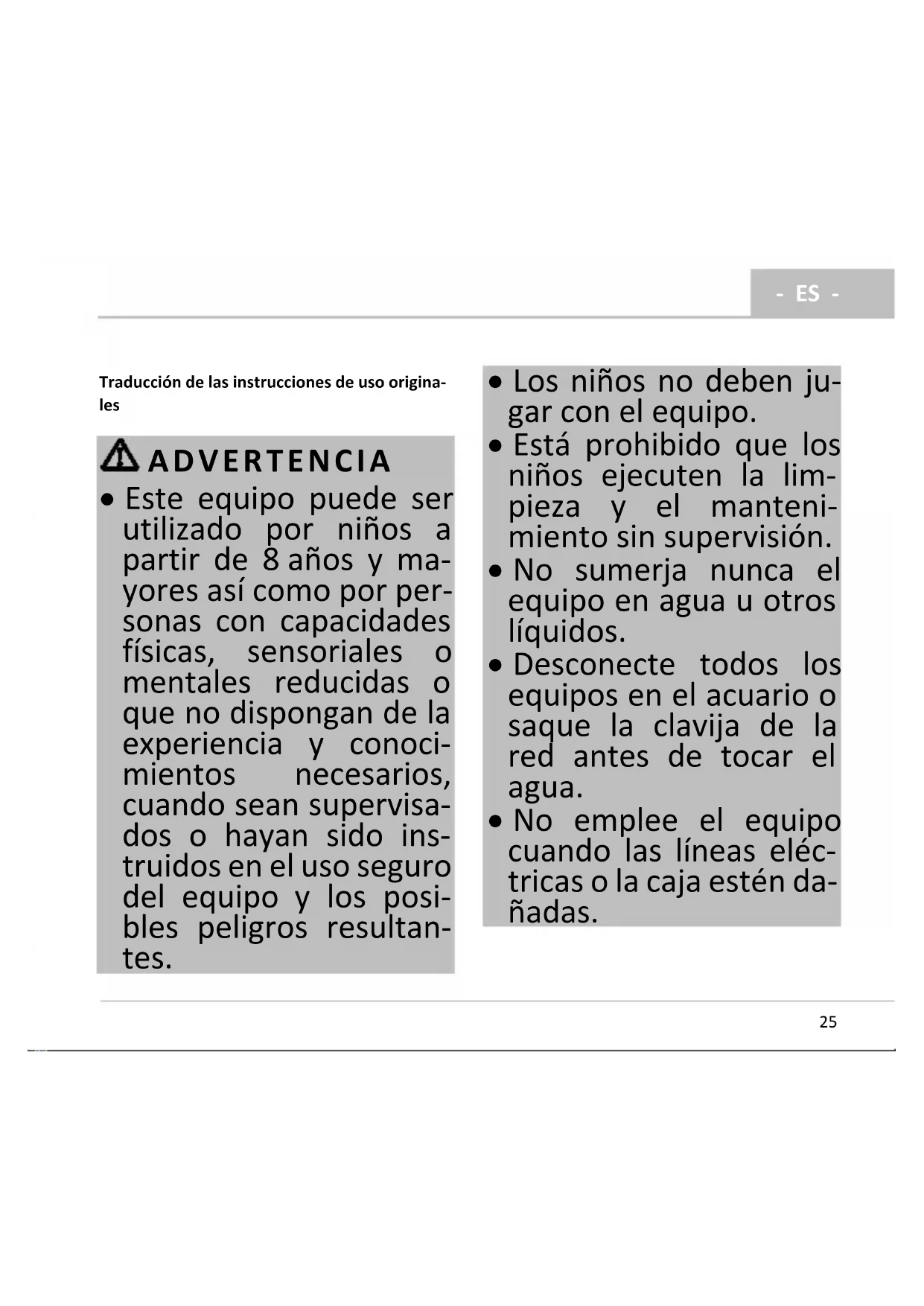 - No emplee el equipo cuando las líneas eléc- tricas o la caja estén da- ñadas.- ES -