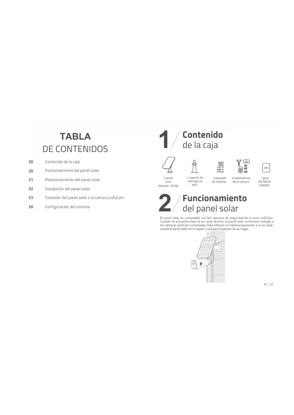 1 panel solarModelo: T87001 soporte de montaje de 360° El panel solar es compatible con las cámaras de seguridad de la serie eufyCam. Cuando se encuentra bajo la luz solar directa, el panel solar suministra energía a las cámaras eufyCam conectadas. Para obtener la máxima exposición a la luz solar, instale el panel solar en el tejado o una pared exterior de su hogar. 1 paquete de tornillos4 adaptadoresde la cámara1 guíaDE INICIO RÁPIDO21 ES ES 22 Cuando se disponga a posicionar el panel solar, tenga en cuenta los siguientes factores, ya que podrían afectar a la eficiencia del panel solar: