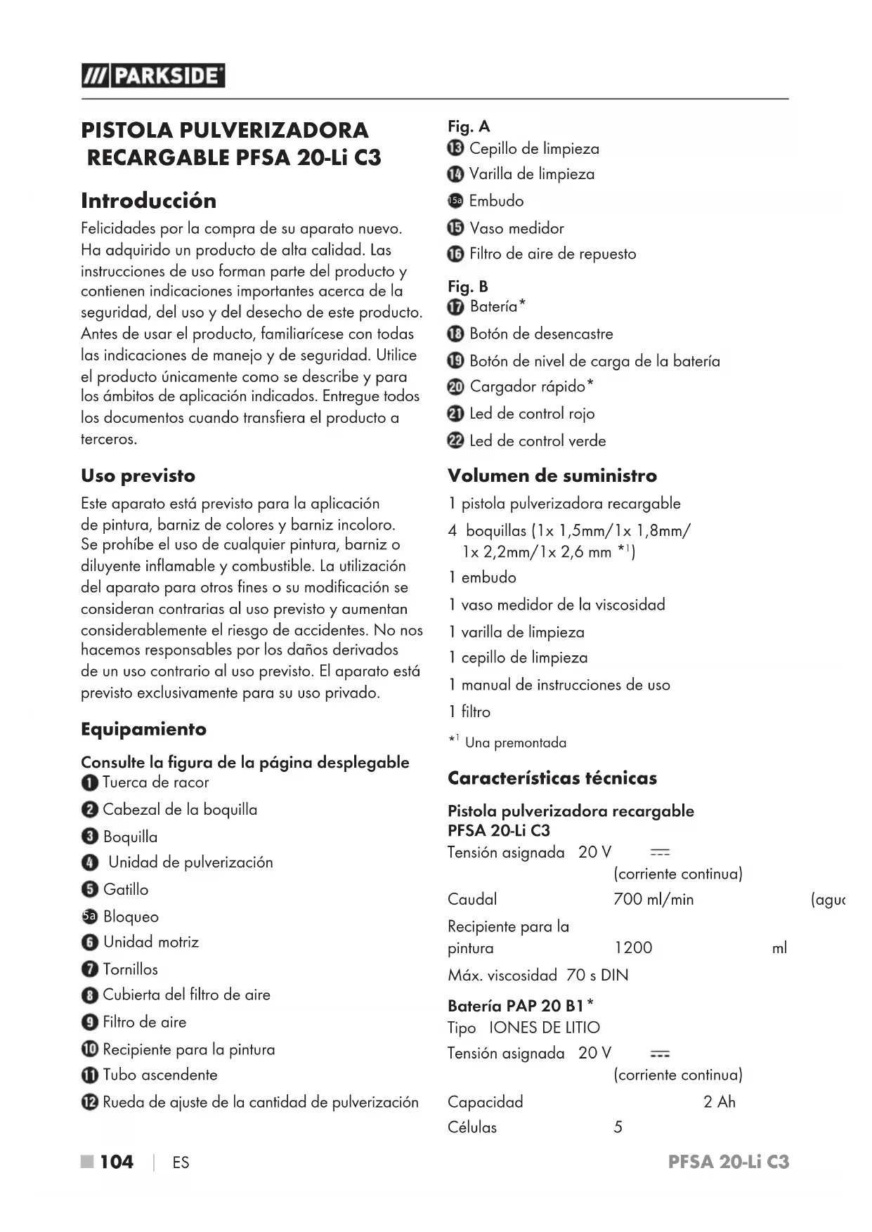 ES PISTOLA PULVERIZADORA RECARGABLE PFSA 20-Li C3 Introducción Felicidades por la compra de su aparato nuevo. Ha adquirido un producto de alta calidad. Las instrucciones de uso forman parte del producto y contienen indicaciones importantes acerca de la seguridad, del uso y del desecho de este producto. Antes de usar el producto, familiarícese con todas las indicaciones de manejo y de seguridad. Utilice el producto únicamente como se describe y para los ámbitos de aplicación indicados. Entregue todos los documentos cuando transfiera el producto a terceros. Uso previsto Este aparato está previsto para la aplicación de pintura, barniz de colores y barniz incoloro. Se prohíbe el uso de cualquier pintura, barniz o diluyente inflamable y combustible. La utilización del aparato para otros fines o su modificación se consideran contrarias al uso previsto y aumentan considerablemente el riesgo de accidentes. No nos hacemos responsables por los daños derivados de un uso contrario al uso previsto. El aparato está previsto exclusivamente para su uso privado. Equipamiento Consulte la figura de la página desplegable Tuerca de racor Cabezal de la boquilla Boquilla Unidad de pulverización Gatillo