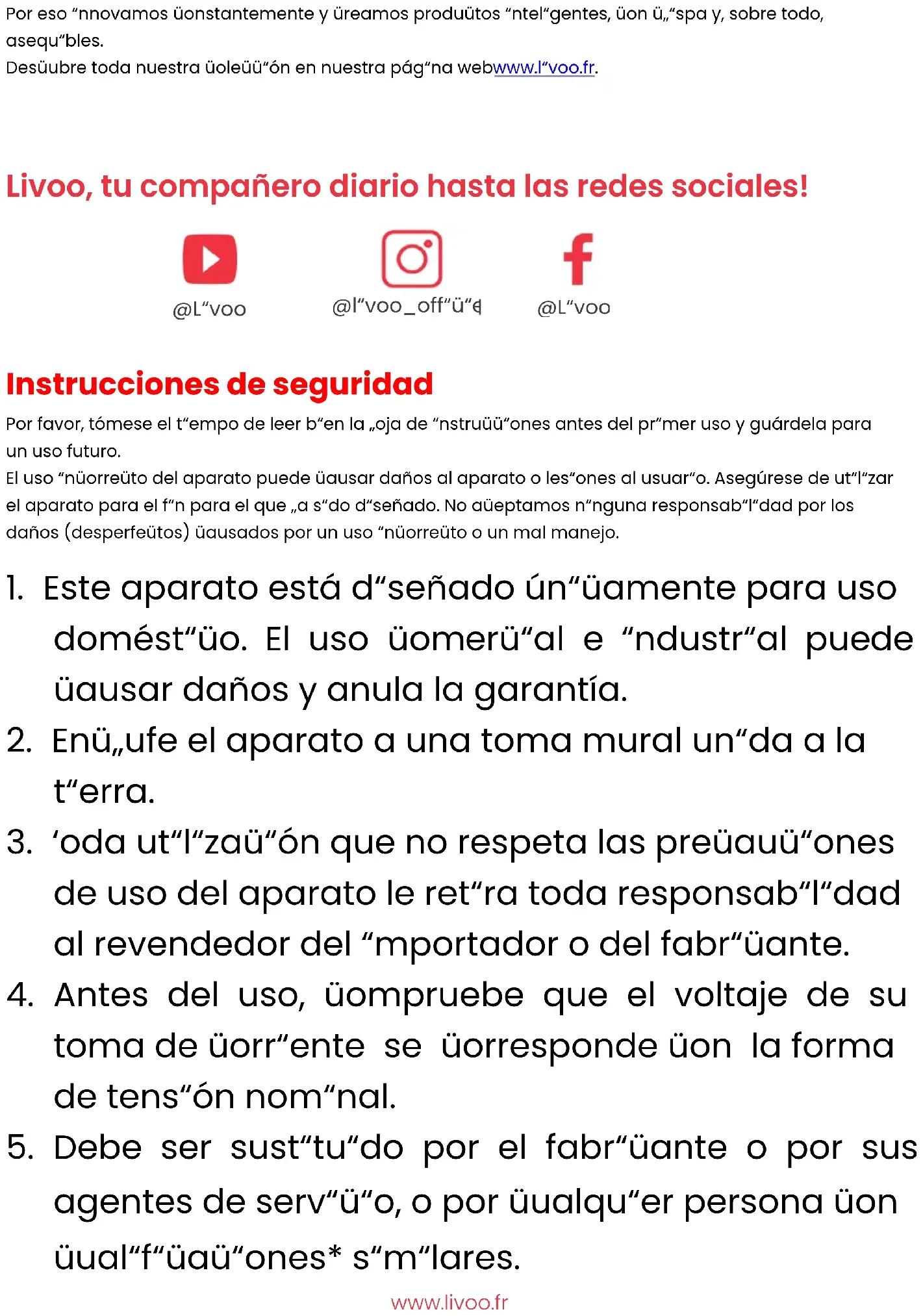 Gracias por haber elegido un producto Livoo! Su batidora, su barbacoa, sus auriculares no son simples objetos, son una extensión de usted que le permite conectar con su gente, reunirla, reír e interactuar. El objetivo de Livoo es ayudarle a vivir su vida a tope sean cuales sean sus gustos a lo largo del año. Raclette en invierno, barbacoa en verano. O al revés. Usted decide. Aproveche esta libertad para disfrutar de momentos de bienestar en su vida diaria. ESwww.livoo.fr Por eso innovamos constantemente y creamos productos inteligentes, con chispa y, sobre todo, asequibles. Descubre toda nuestra colección en nuestra página web www.livoo.fr.