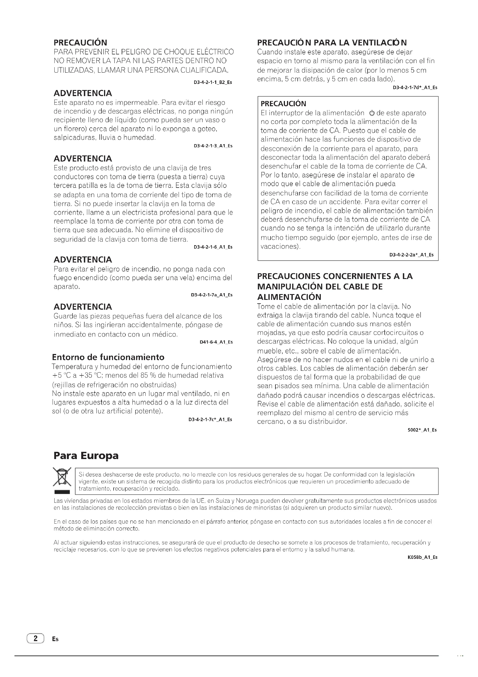 Para Europa PRECAUCIÓN PARA PREVENIR EL PELIGRO DE CHOQUE ELÉCTRICO NO REMOVER LA TAPA NI LAS PARTES DENTRO NO UTILIZADAS, LLAMAR UNA PERSONA CUALIFICADA. D3-4-2-1-1_B2_Es ADVERTENCIA Este aparato no es impermeable. Para evitar el riesgo de incendio y de descargas eléctricas, no ponga ningún recipiente lleno de líquido (como pueda ser un vaso o un florero) cerca del aparato ni lo exponga a goteo, salpicaduras, lluvia o humedad. D3-4-2-1-3_A1_Es ADVERTENCIA Este producto está provisto de una clavija de tres conductores con toma de tierra (puesta a tierra) cuya tercera patilla es la de toma de tierra. Esta clavija sólo se adapta en una toma de corriente del tipo de toma de tierra. Si no puede insertar la clavija en la toma de corriente, llame a un electricista profesional para que le reemplace la toma de corriente por otra con toma de tierra que sea adecuada. No elimine el dispositivo de seguridad de la clavija con toma de tierra. D3-4-2-1-6_A1_Es ADVERTENCIA Para evitar el peligro de incendio, no ponga nada con fuego encendido (como pueda ser una vela) encima del aparato. D3-4-2-1-7a_A1_Es Entorno de funcionamiento Temperatura y humedad del entorno de funcionamiento +5 °C a +35 °C; menos del 85 % de humedad relativa (rejillas de refrigeración no obstruidas) No instale este aparato en un lugar mal ventilado, ni en lugares expuestos a alta humedad o a la luz directa del sol (o de otra luz artificial potente). D3-4-2-1-7c*_A1_Es PRECAUCI