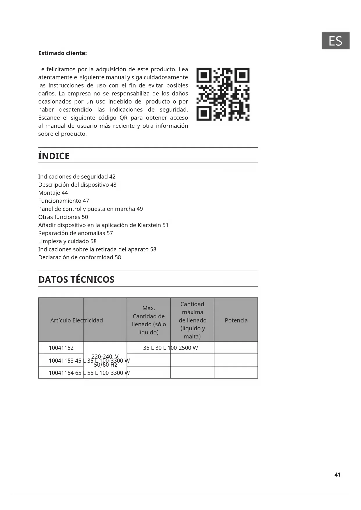 Estimado cliente: Le felicitamos por la adquisición de este producto. Lea atentamente el siguiente manual y siga cuidadosamente las instrucciones de uso con el n de evitar posibles daños. La empresa no se responsabiliza de los daños ocasionados por un uso indebido del producto o por haber desatendido las indicaciones de seguridad. Escanee el siguiente código QR para obtener acceso al manual de usuario más reciente y otra información sobre el producto. ÍNDICE Indicaciones de seguridad 42 Descripción del dispositivo 43 Montaje 44 Funcionamiento 47 Panel de control y puesta en marcha 49 Otras funciones 50 Añadir dispositivo en la aplicación de Klarstein 51 Reparación de anomalías 57 Limpieza y cuidado 58 Indicaciones sobre la retirada del aparato 58 Declaración de conformidad 58